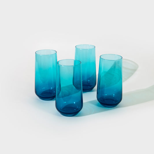 Various azure, turquoise, capri blue, cobalt, and light blue glassware.