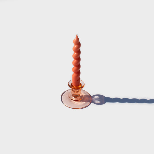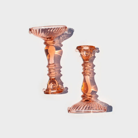 An assortment of vases, candleholders, pedestal dishes, and decorative items for adding a pop of color to a shelf or surface.