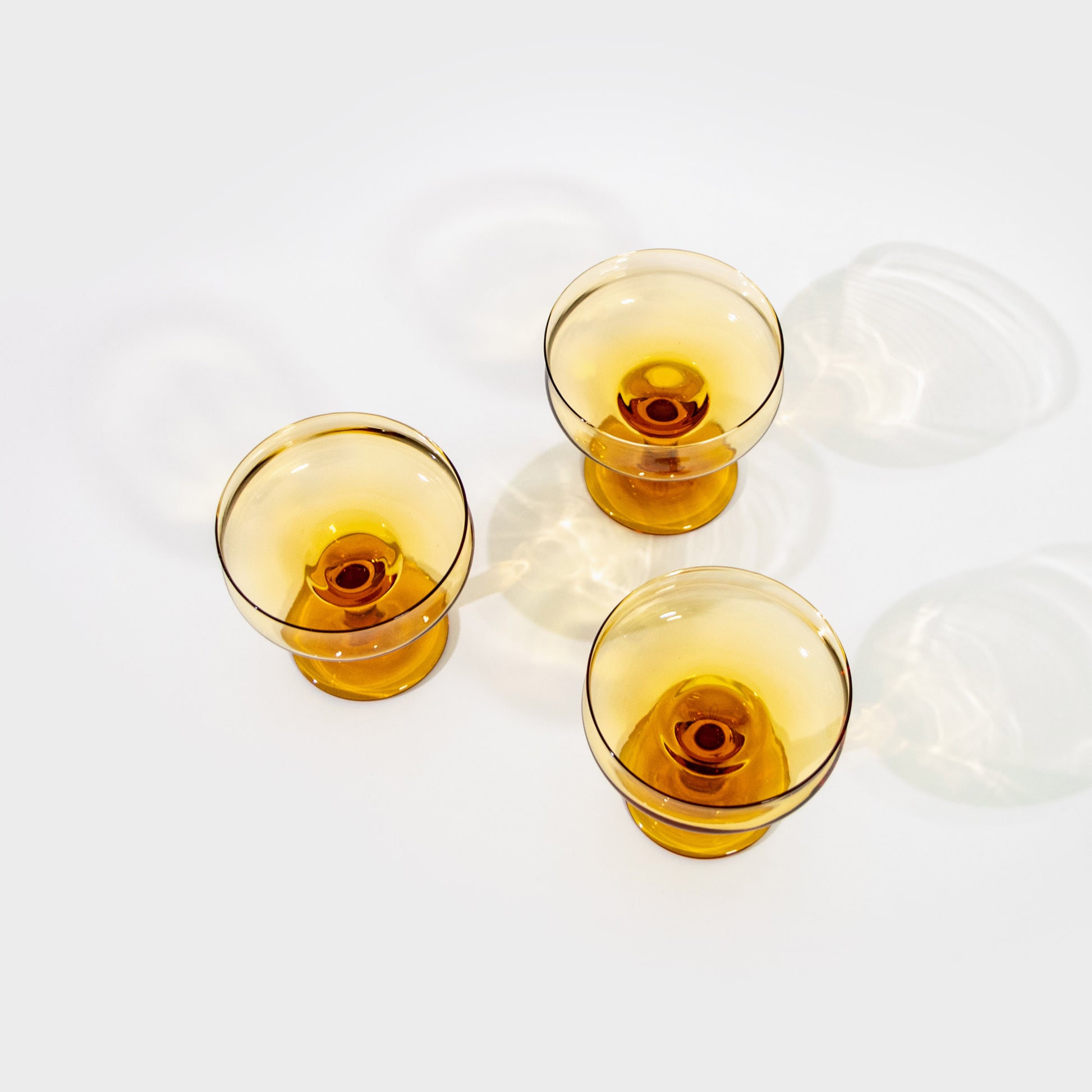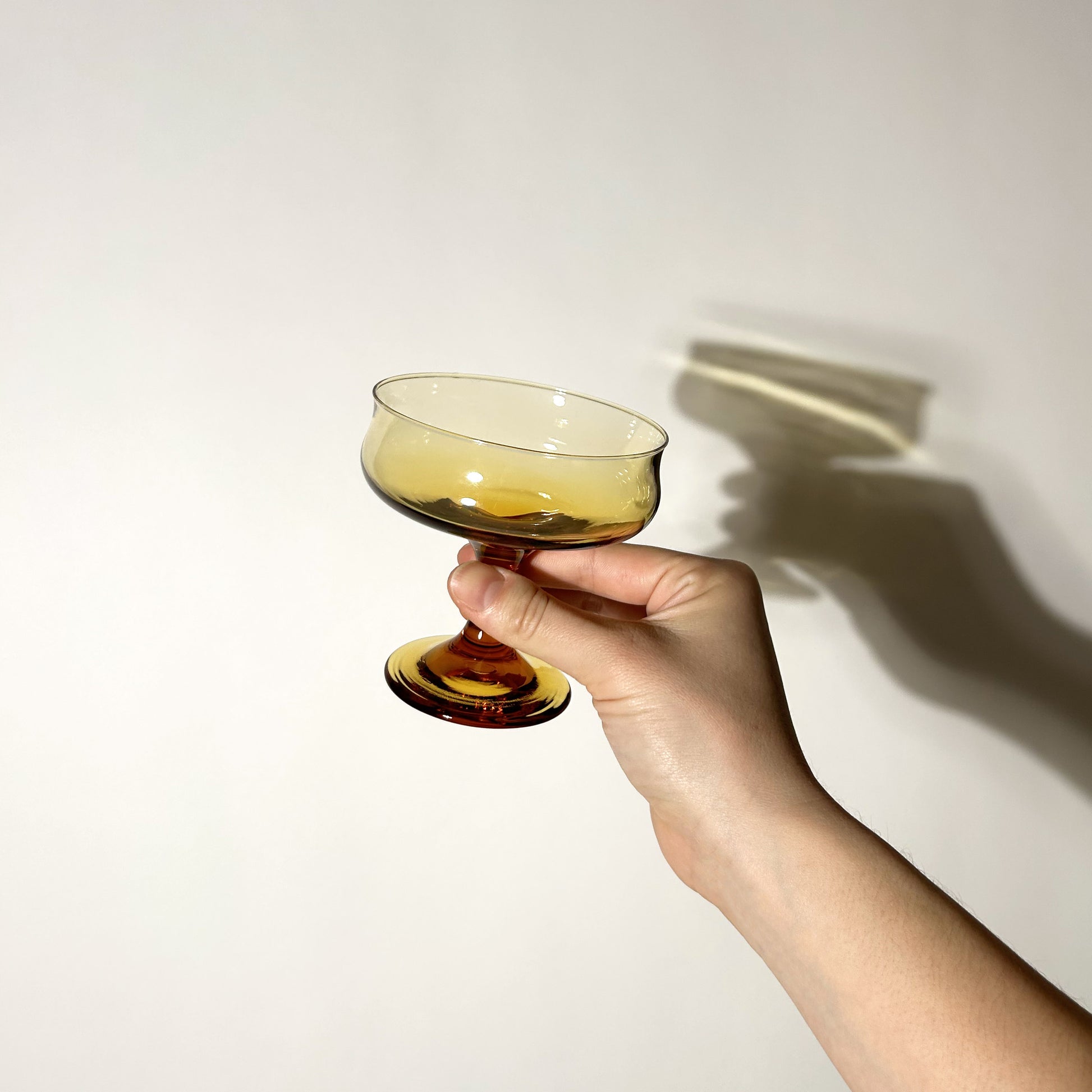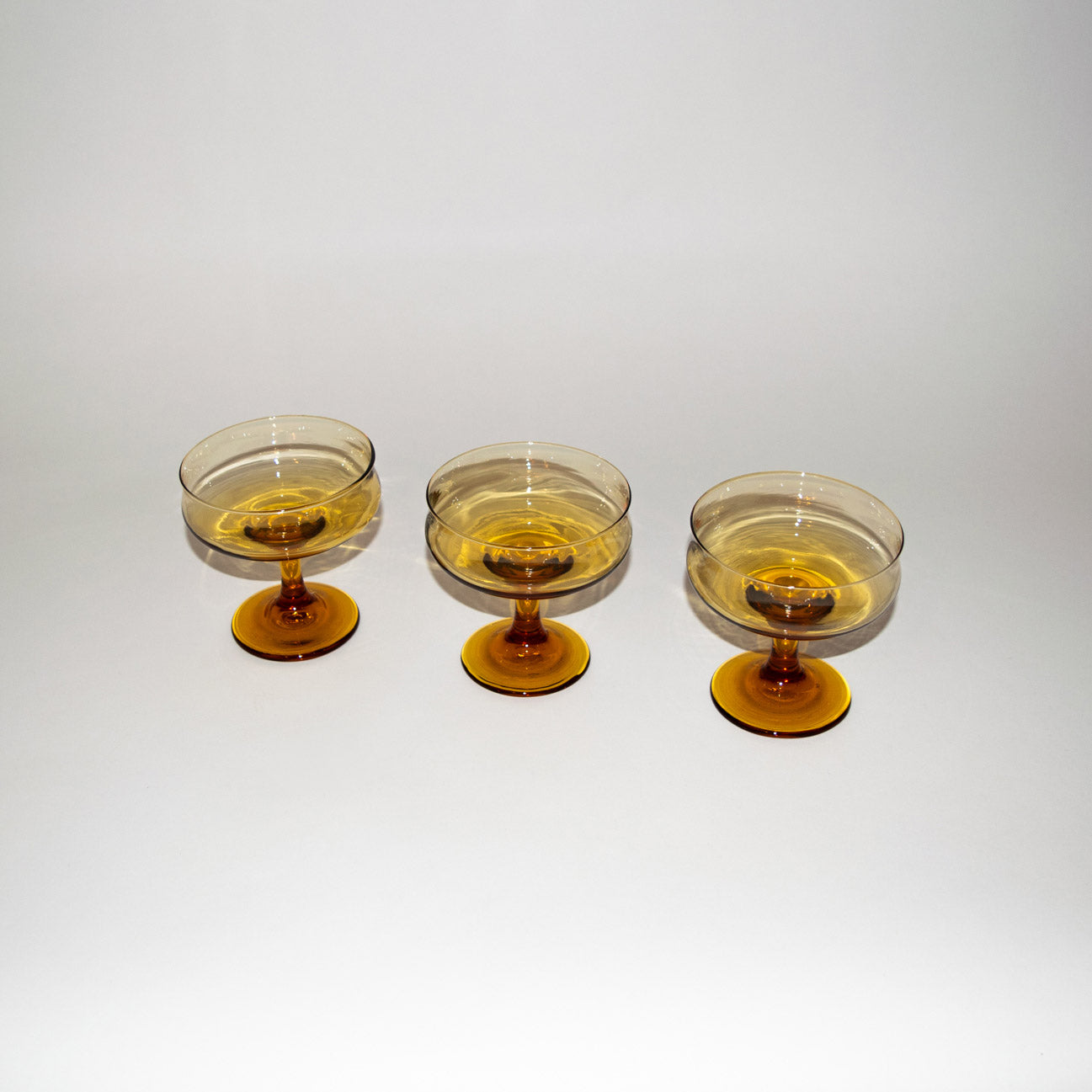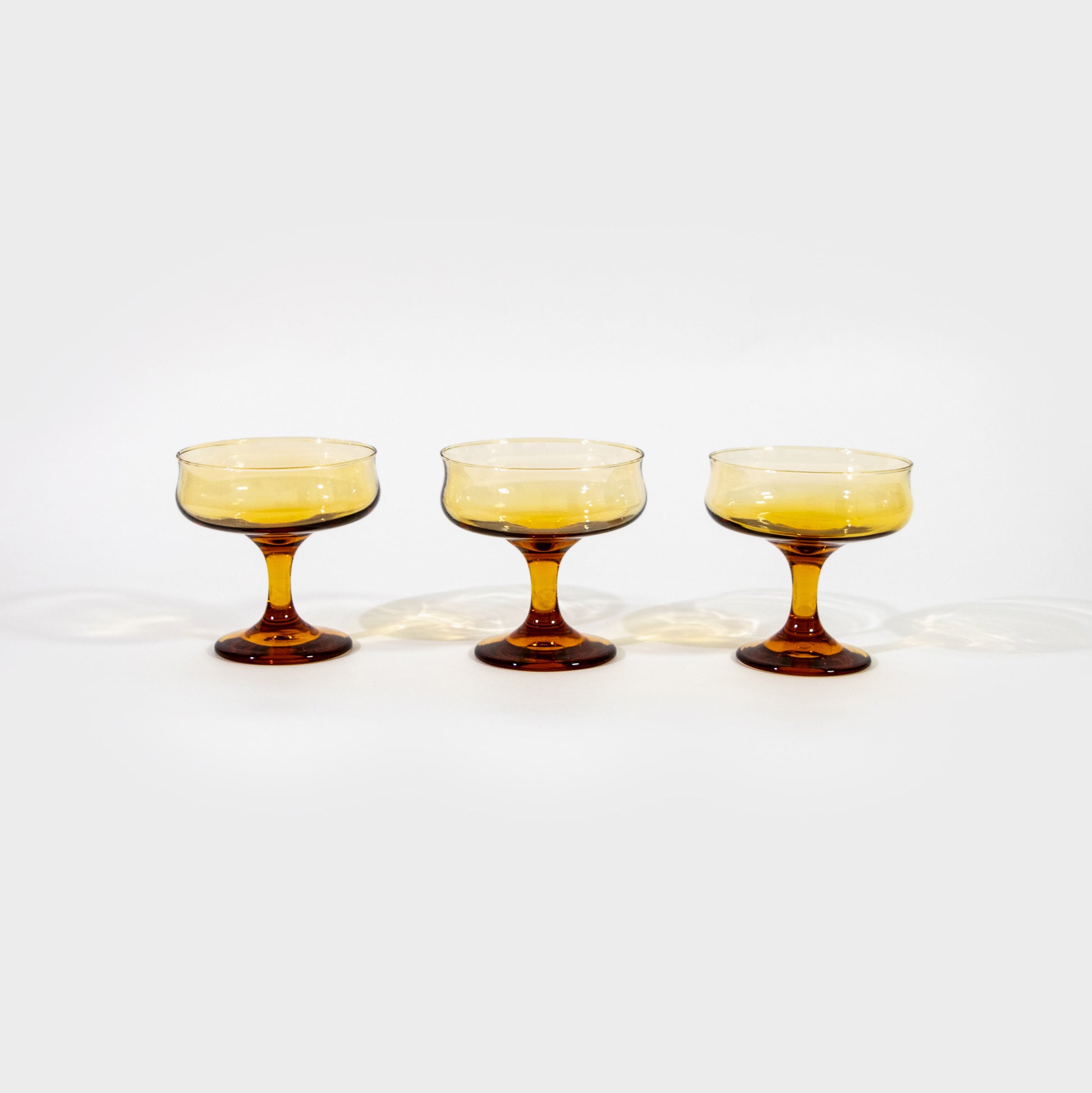 Elevate your next soirée with a touch of mid-century modern style. These amber-colored coupe glasses have a slightly flared, tulip-shaped rim. Perfect for sipping something bubbly or serving an elegant dessert. Vintage Libbey Glass Co. Sold as a full set of three.