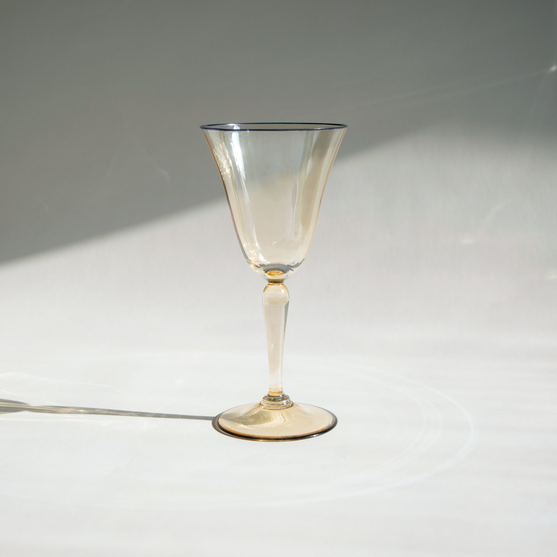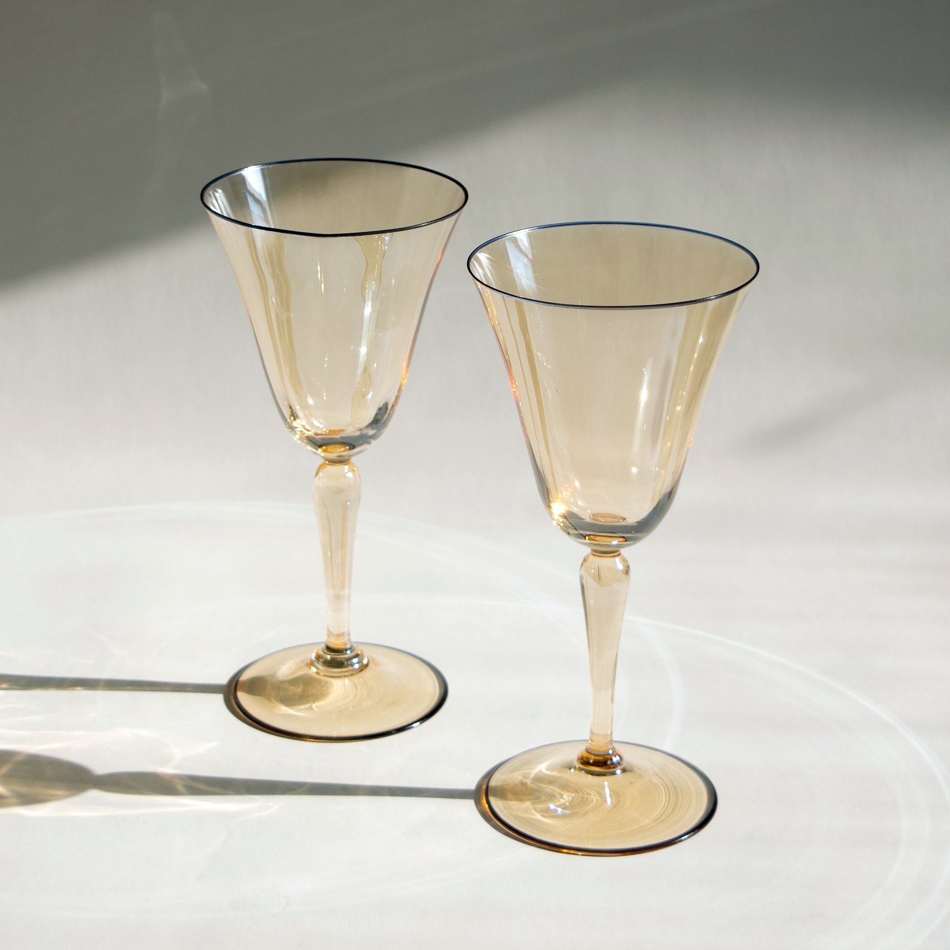Stunning vintage Czech-style wine glasses in an amber optic glass pattern with an iridescent finish, and contrasting cobalt blue trim at the opening and base. Sold as a set of two.