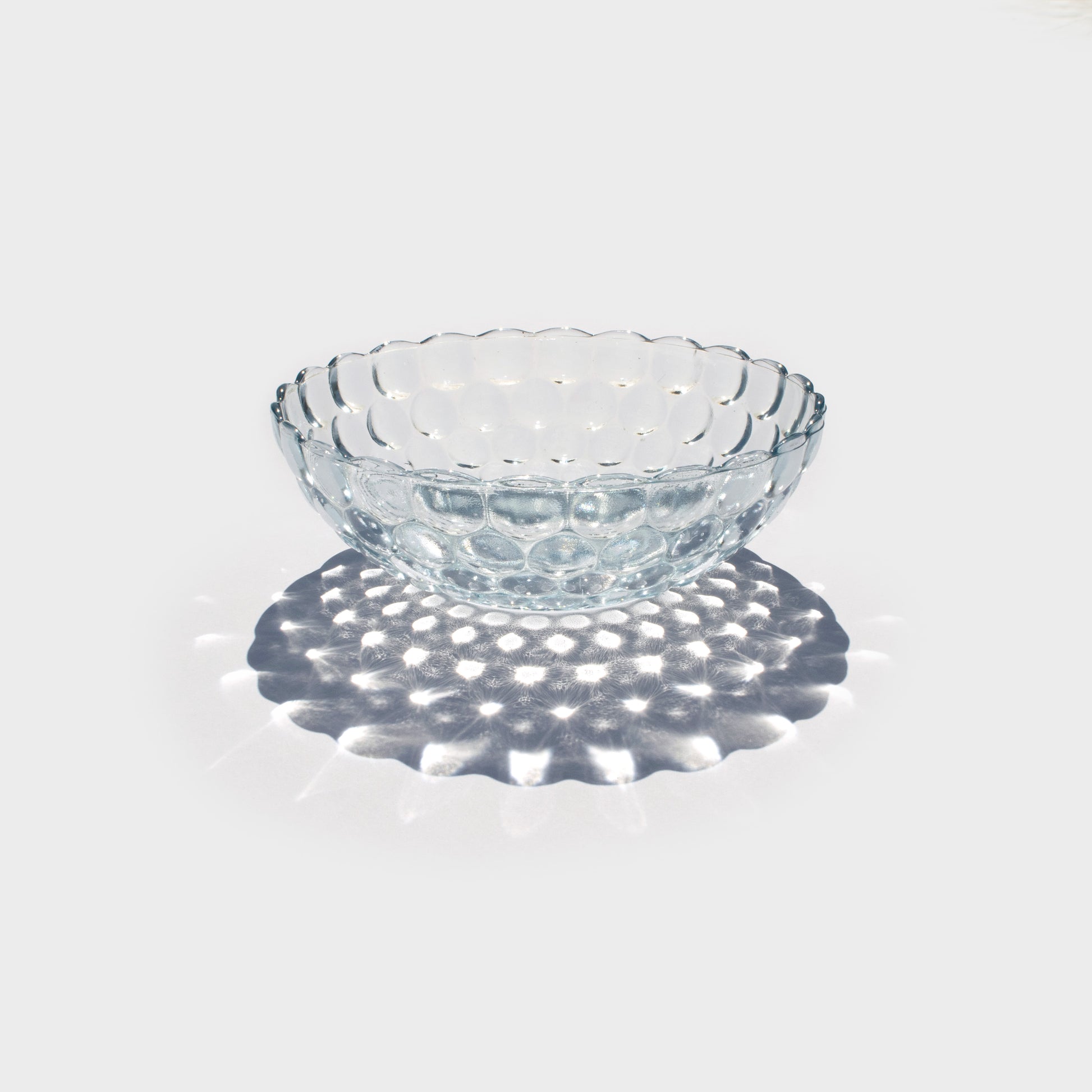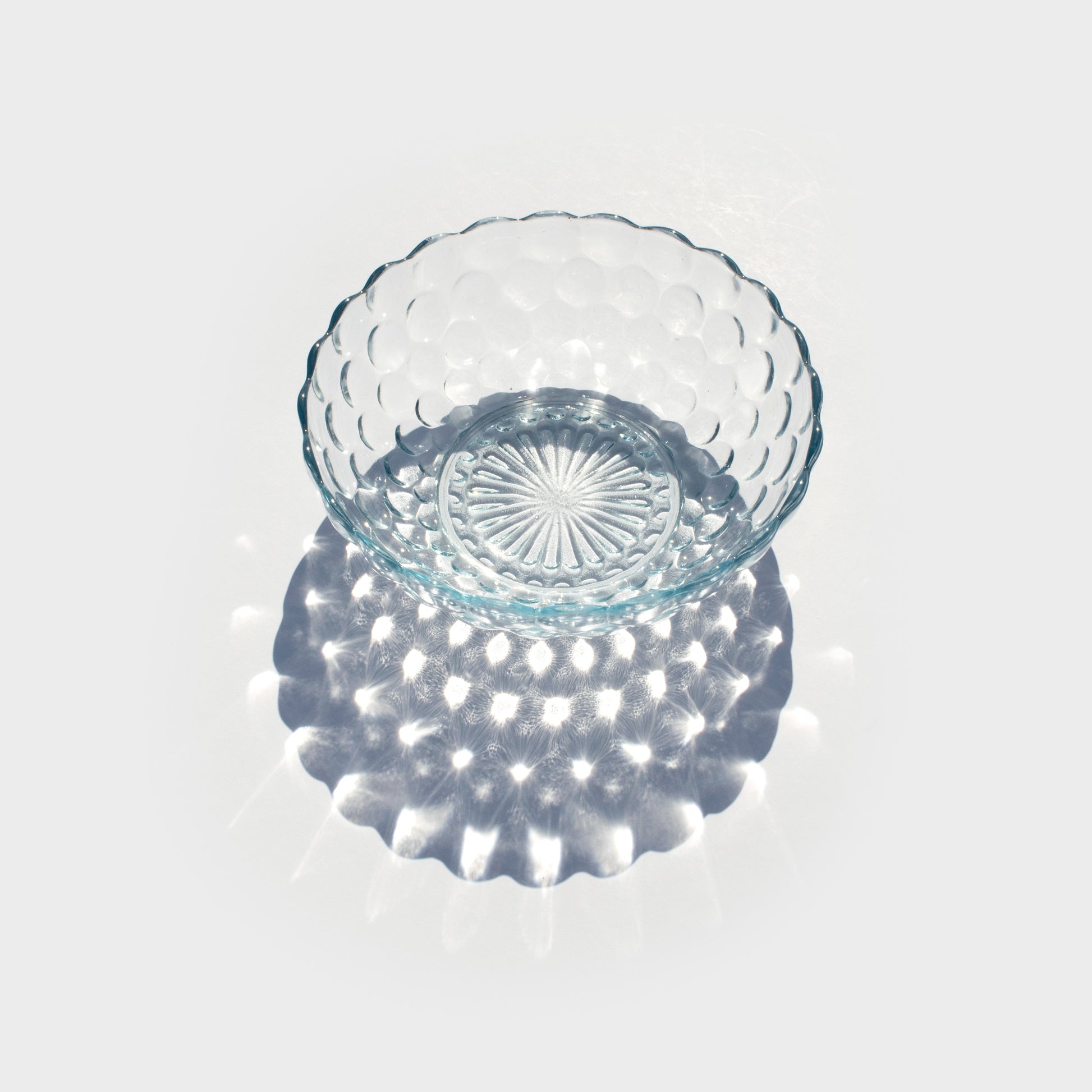 Light blue pressed glass bowl, in the vintage bubble pattern by Anchor Hocking. A perfect size for a solo salad, serving popcorn, holding a few pieces of fruit, or other small trinkets. A whimsical addition to any space.