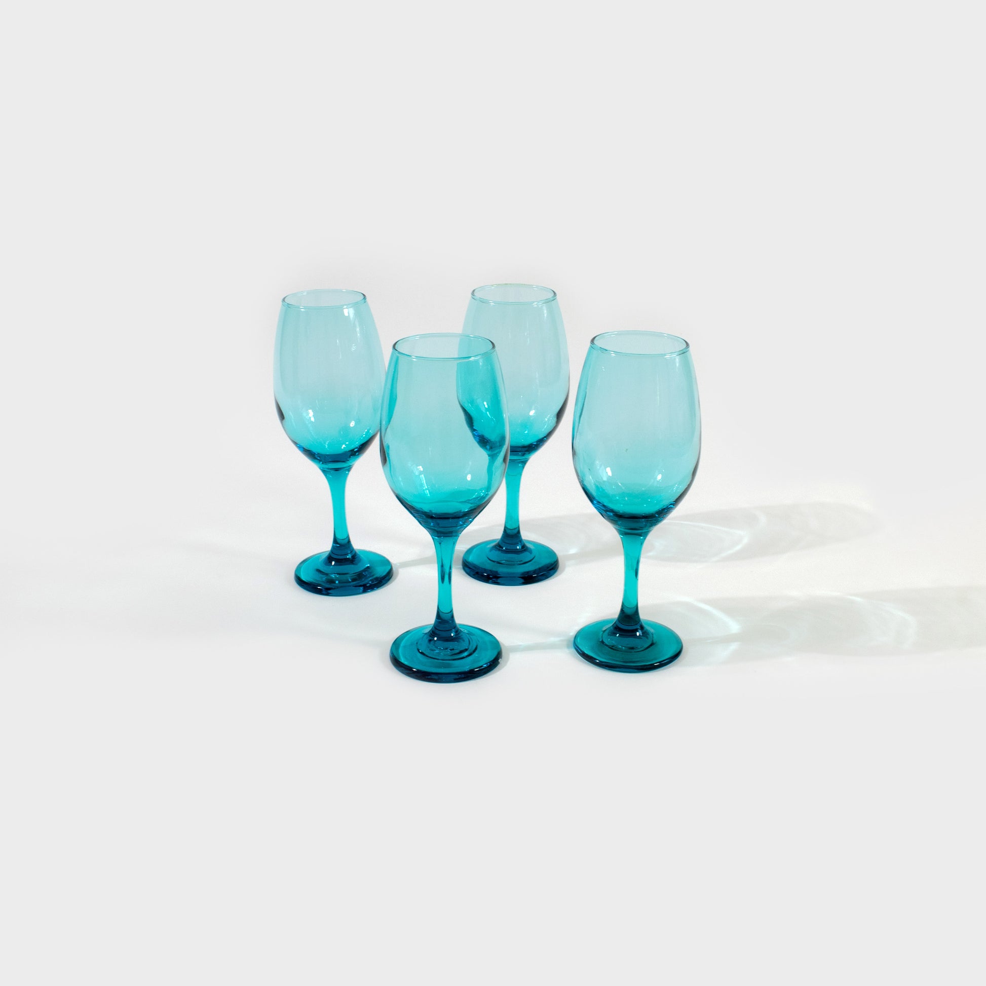 Turquoise blue wine glasses by Cristar Rioja. A longer bowl shape than normal with narrow rim and thick, rounded foot. Sold as a set of four.