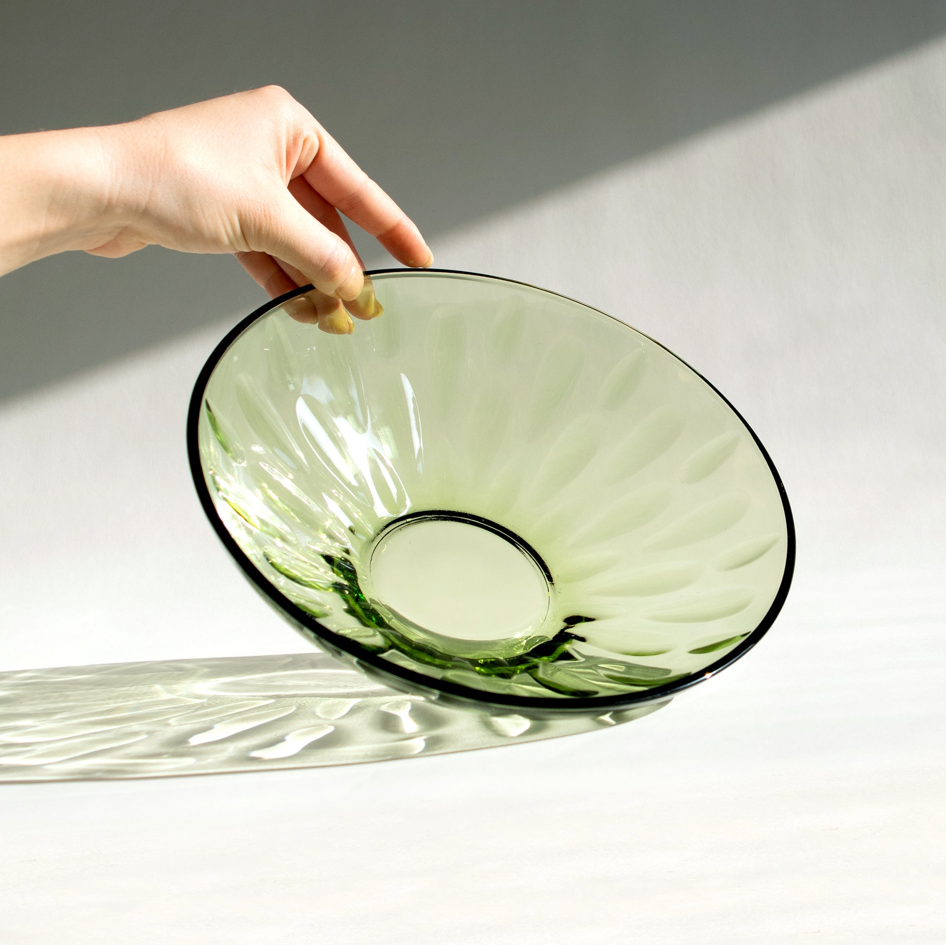 Vintage thumbprint pattern bowl in the Lyric Green (Avocado) colorway by Hazel-Atlas. Can be used to serve shared dishes, or stand alone as a mid-cetury modern accent piece.