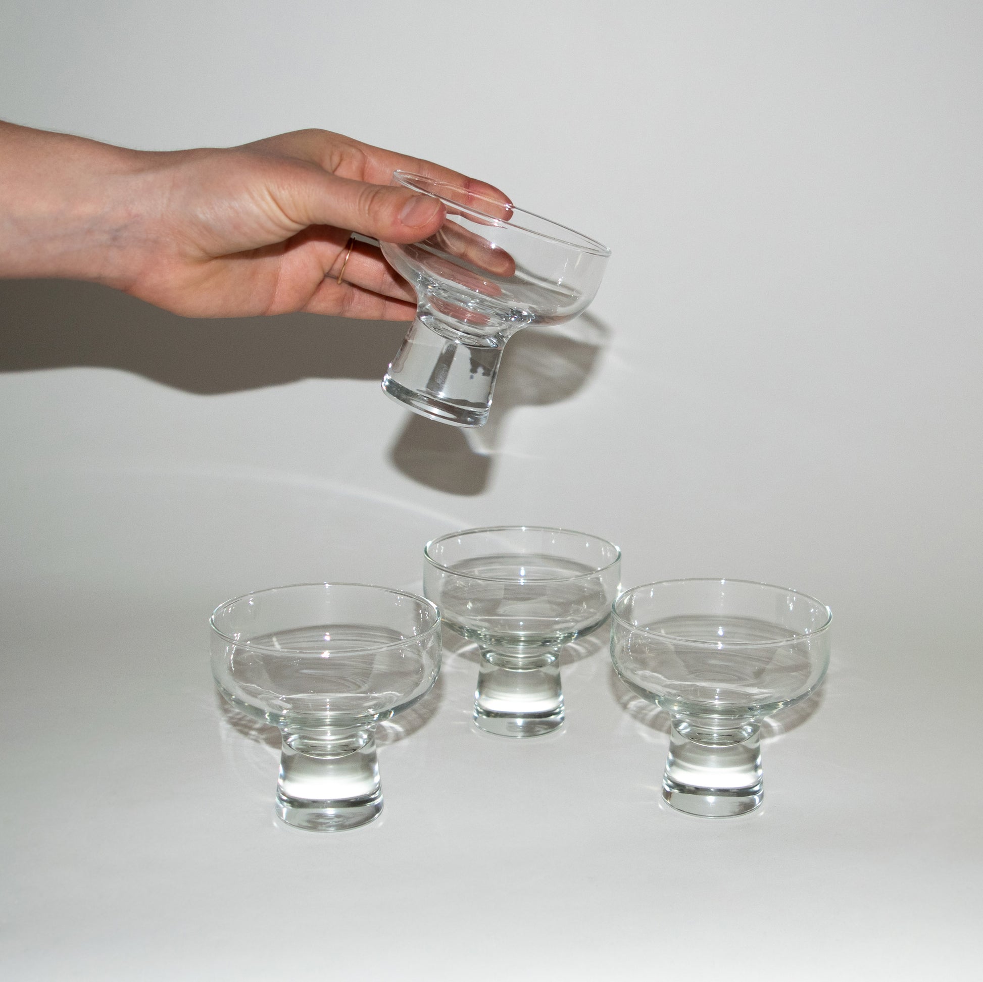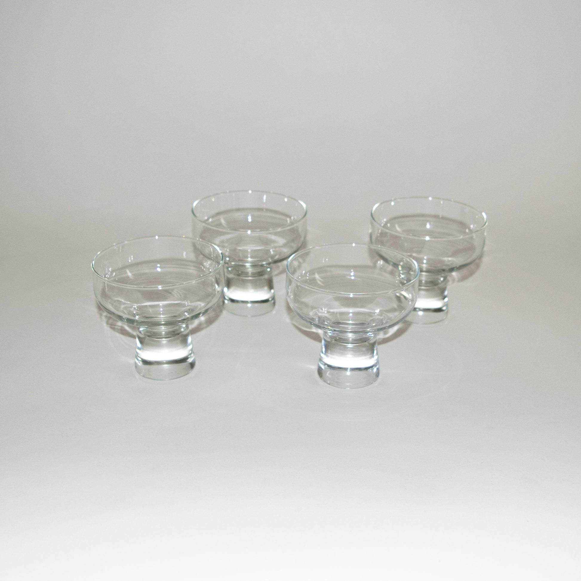 Scandinavian-style clear glass votive candleholders, featuring a wide opening with a small depression at the bottom, and a thick, weighted stem. A modern and minimal addition to any space. These could probably double as an interesting tumbler glass, too! Sold as a set of four.