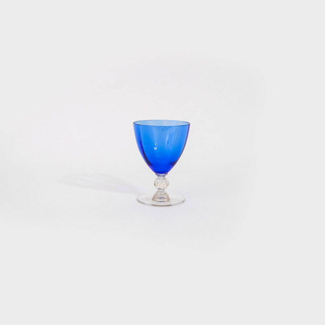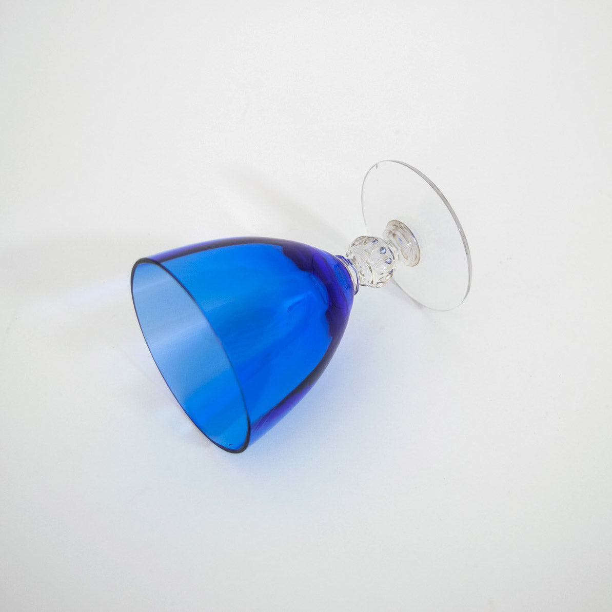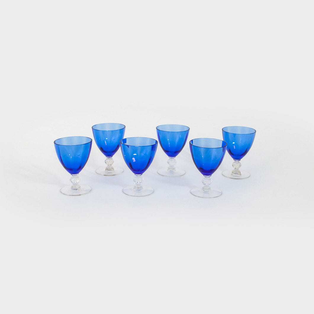 Vintage 1930s-era cordial glasses with a rich, cobalt blue bowl and detailed clear stem. Reminiscent of Cambridge Glass and Morgantown pieces, but features a light optic pattern in the bowl—the perfect petite pop of color for after-dinner amaros and dessert liqueurs. Sold as a set of six.