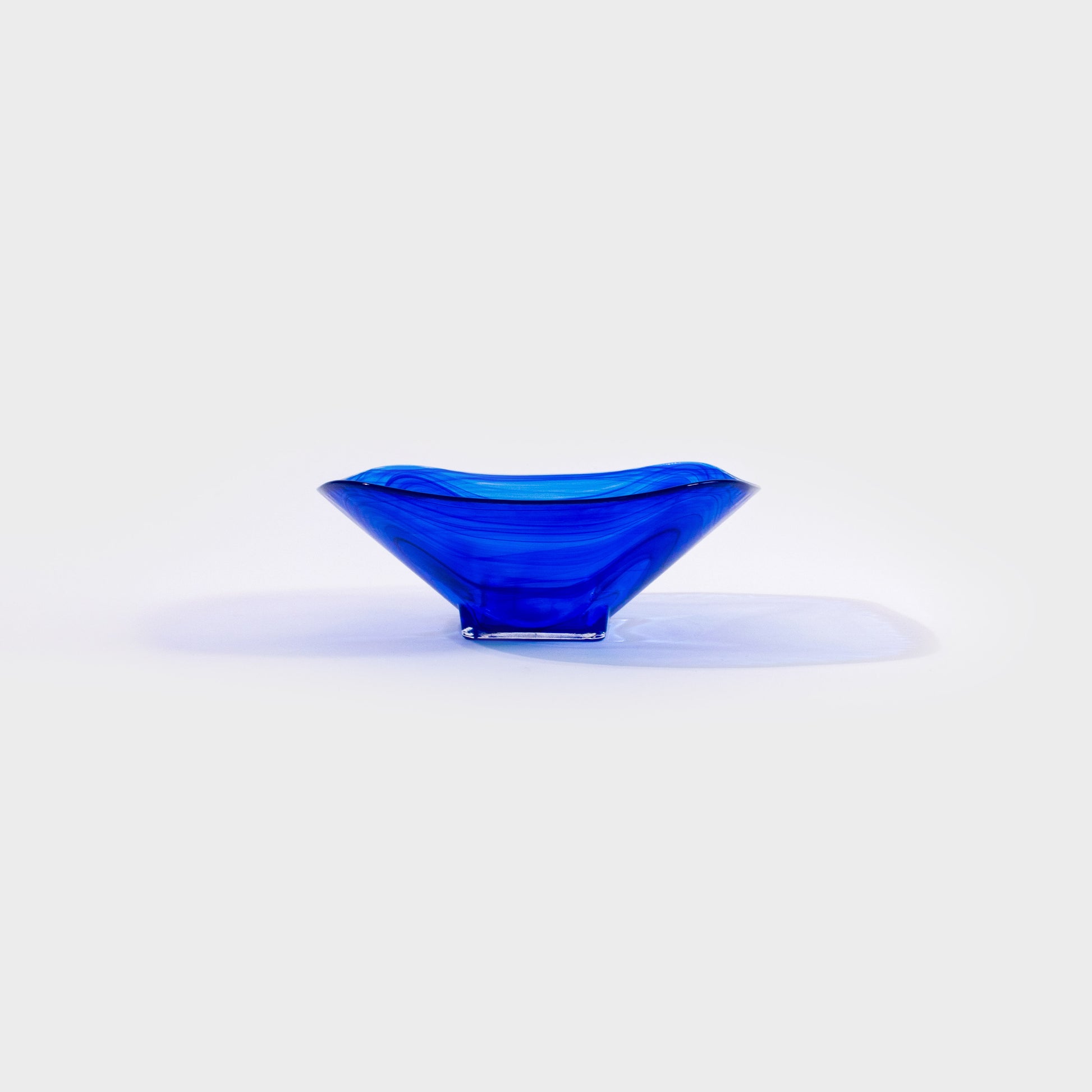 An interesting bowl with a rounded square shape rim and molded square base. Gorgeous cobalt blue swirled glass, made in Turkey.