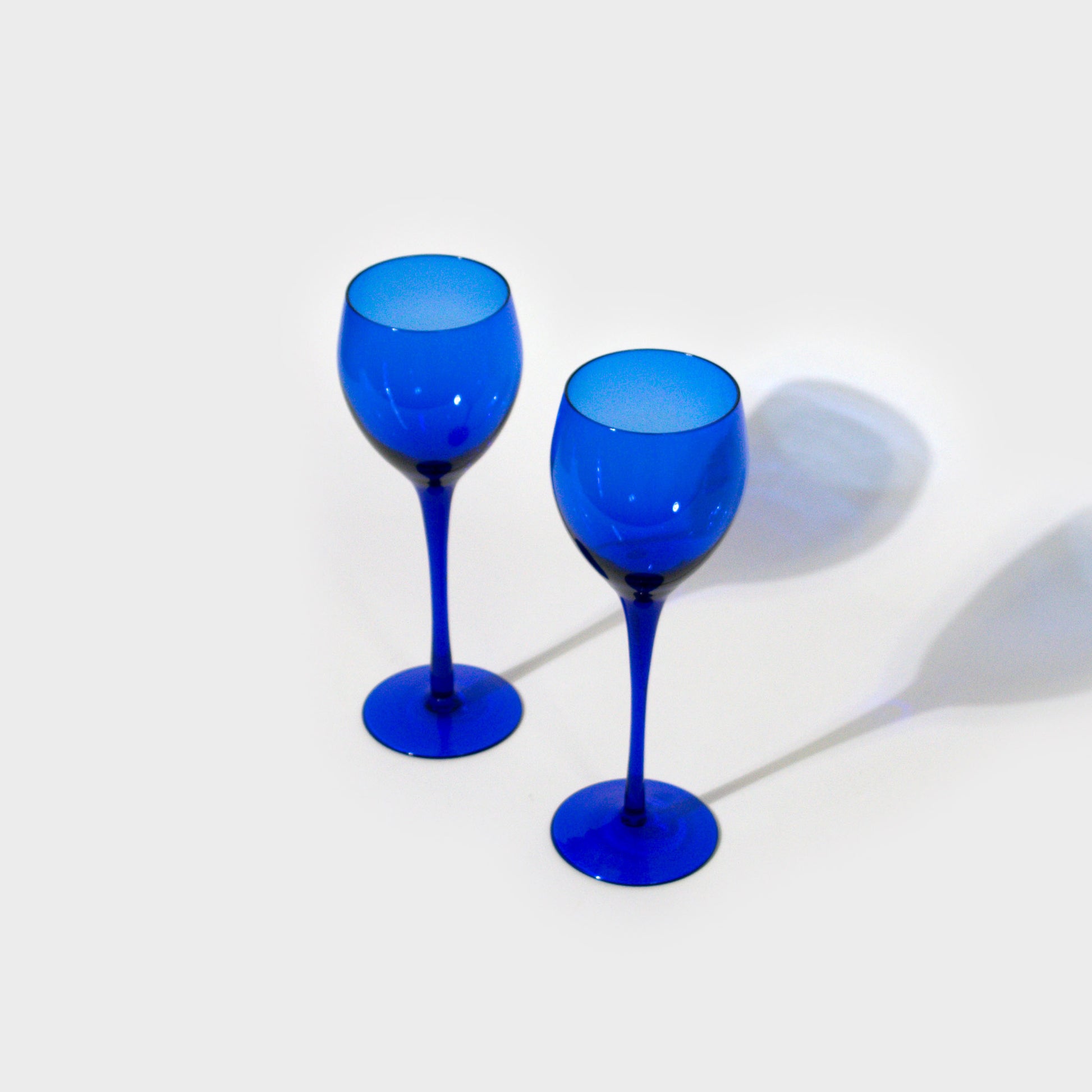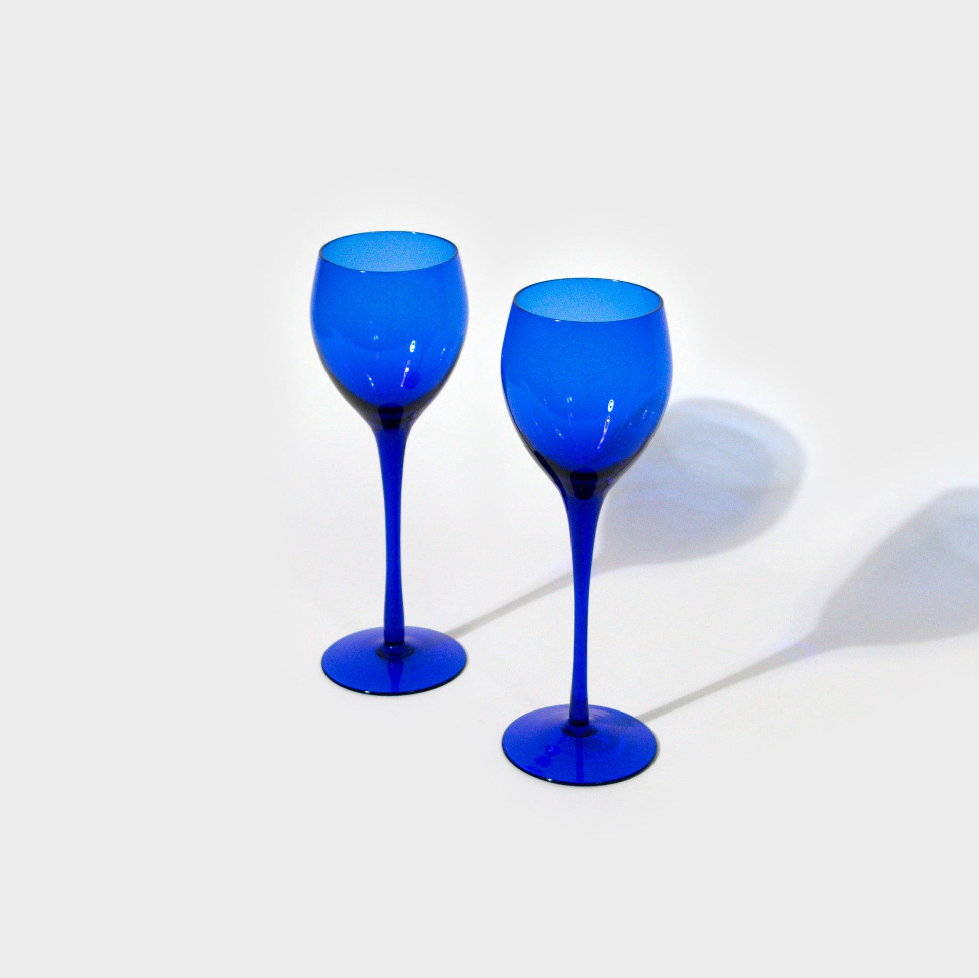 A classic wine glass with an elegant and bold twist ~ a smaller cobalt blue bowl with a long, applied glass stem. Sold as a set of two.