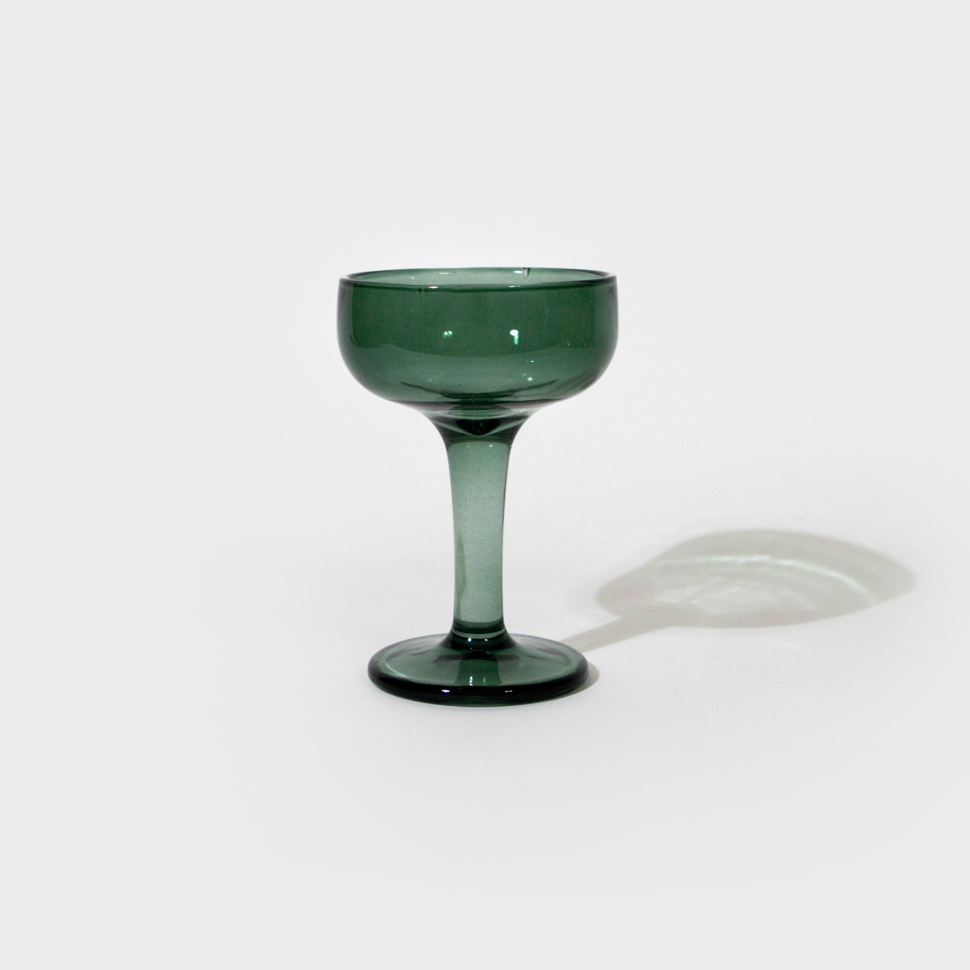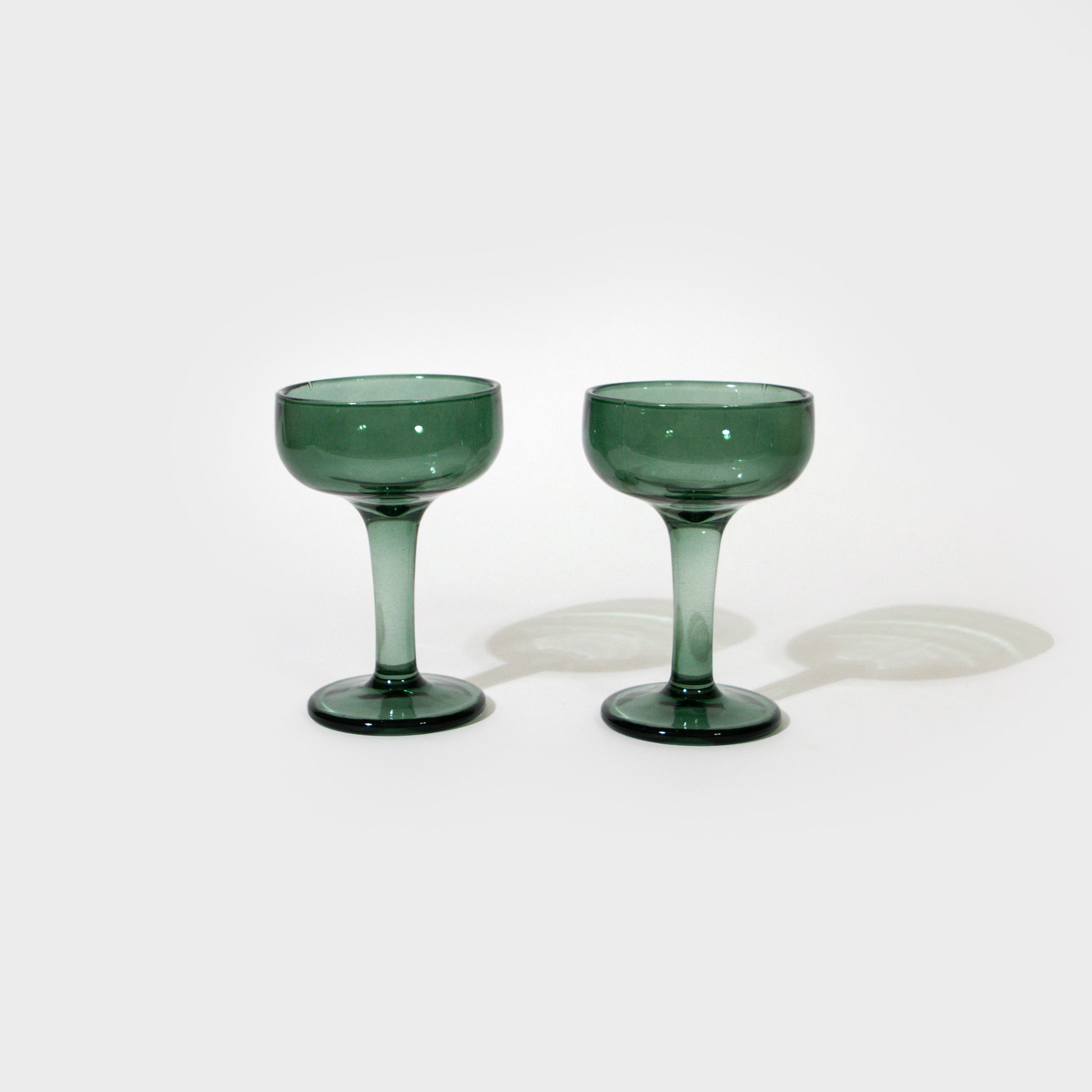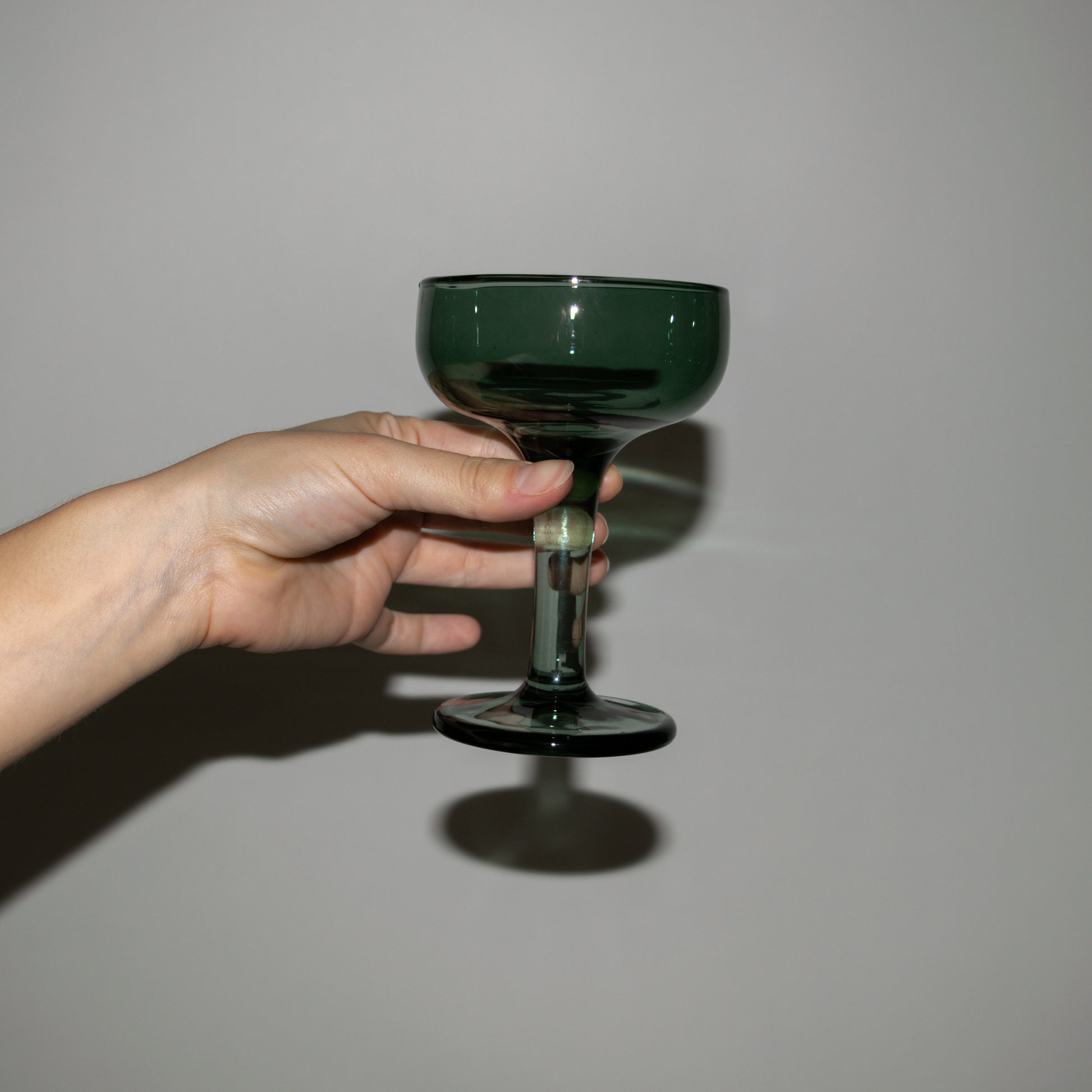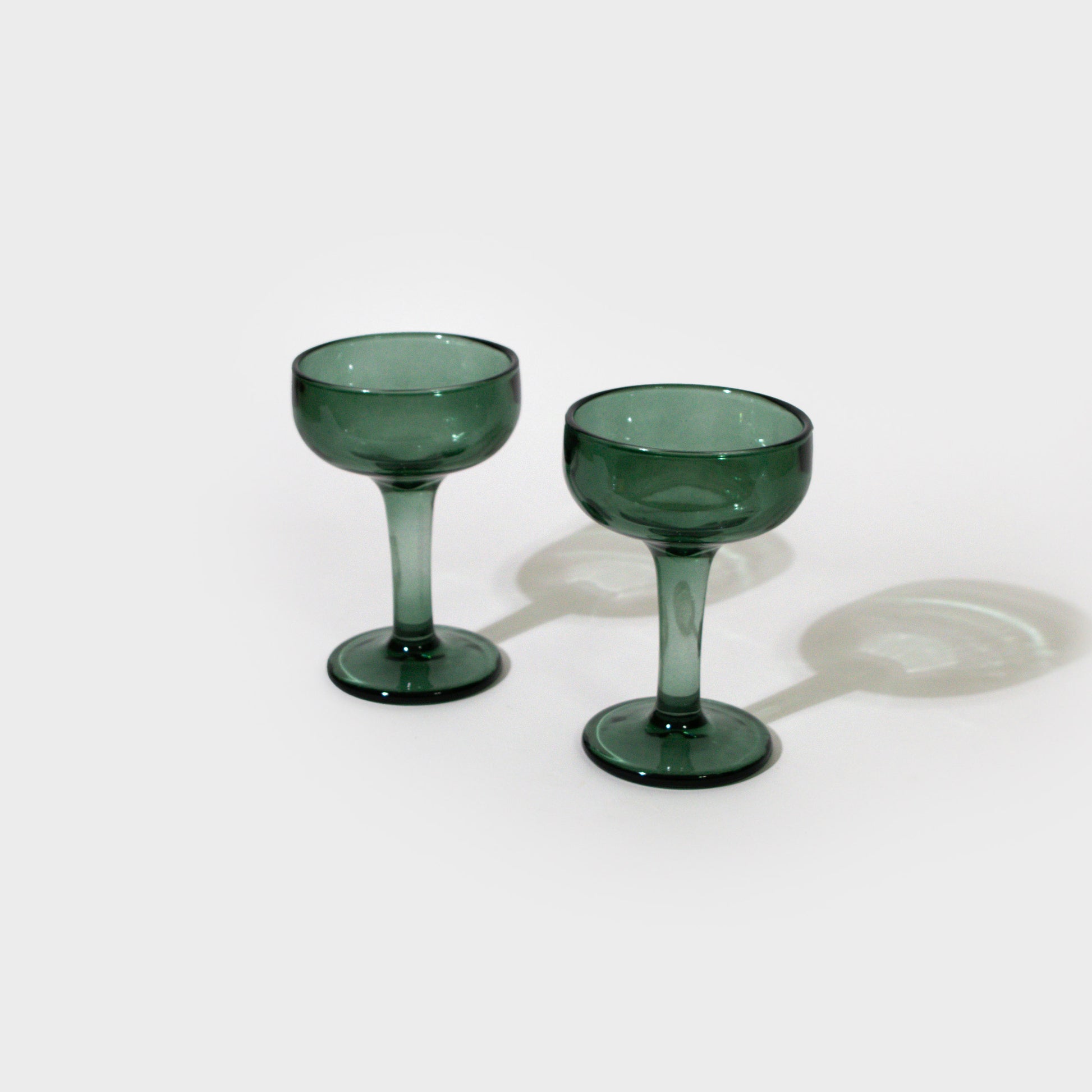 Dark green cocktail glasses with a thick emerald-colored glass. The perfect margarita glass, as it resembles handblown Mexican glass. Sold in sets of two.