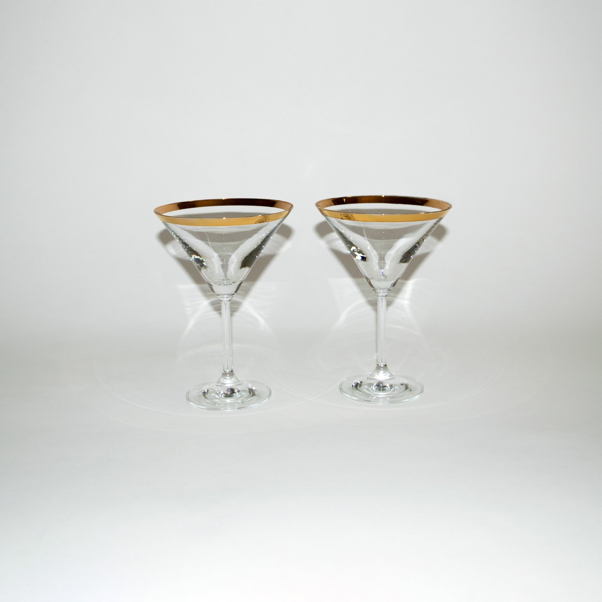 Add a touch of glam to your bar cart with these art deco-style classic clear martini glasses, with a wide gold trim detail. Truly stunning in person - the gold has a reflective mirrored quality that really pops! Sold individually.