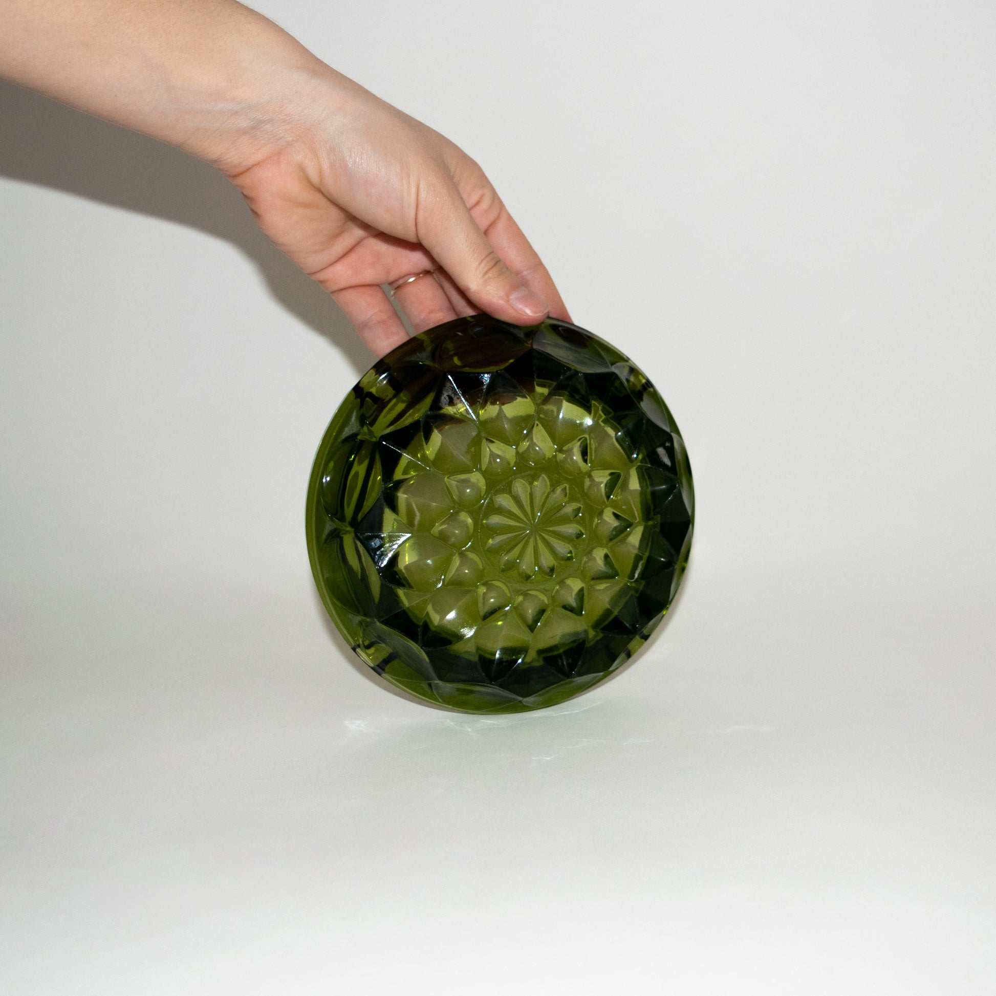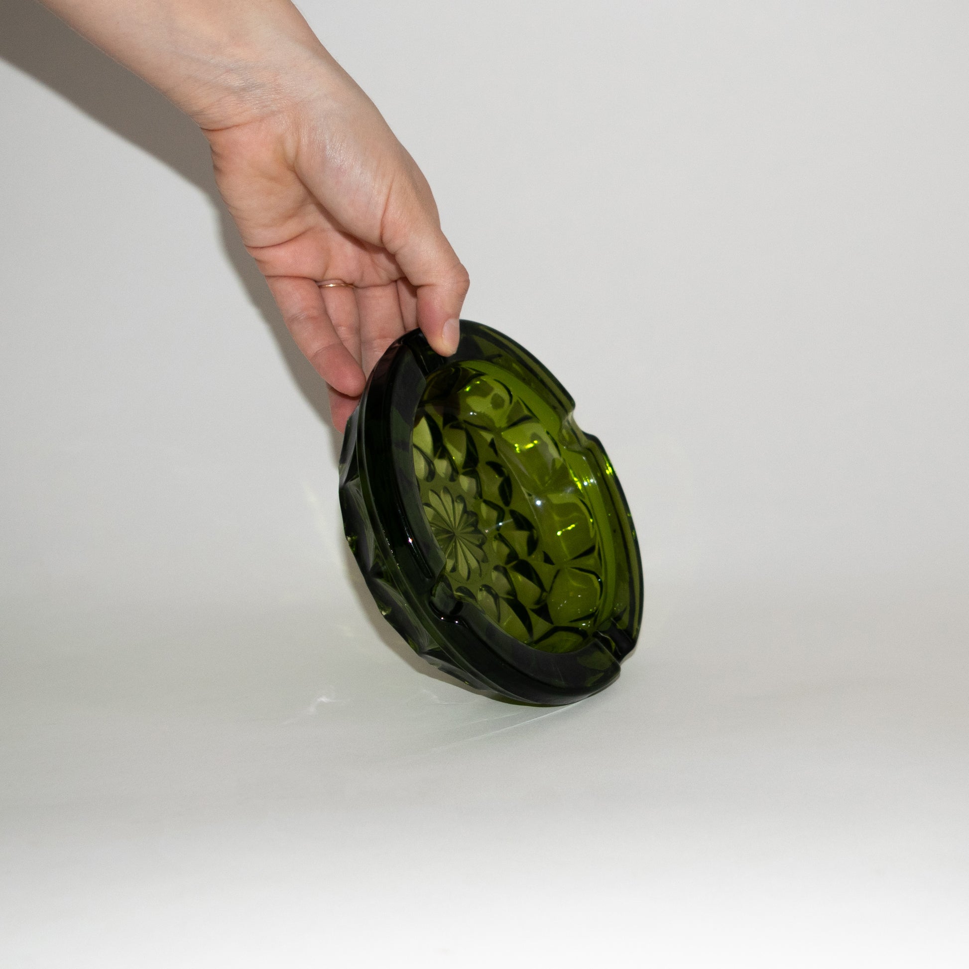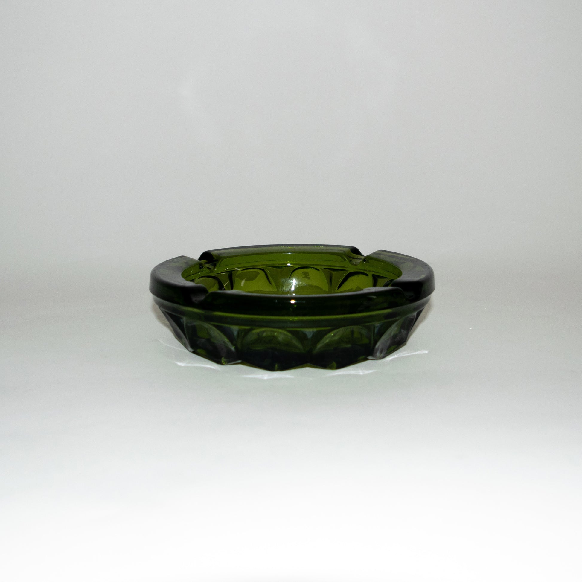 Vintage mcm-style dark olive green ashtray, in the "Fairfield" starburst pattern and Avocado Green colorway by Anchor Hocking. It has a heavier weight to it, ideal for styling on top of books or magazines, and adding Mad Men vibes to any coffee table.