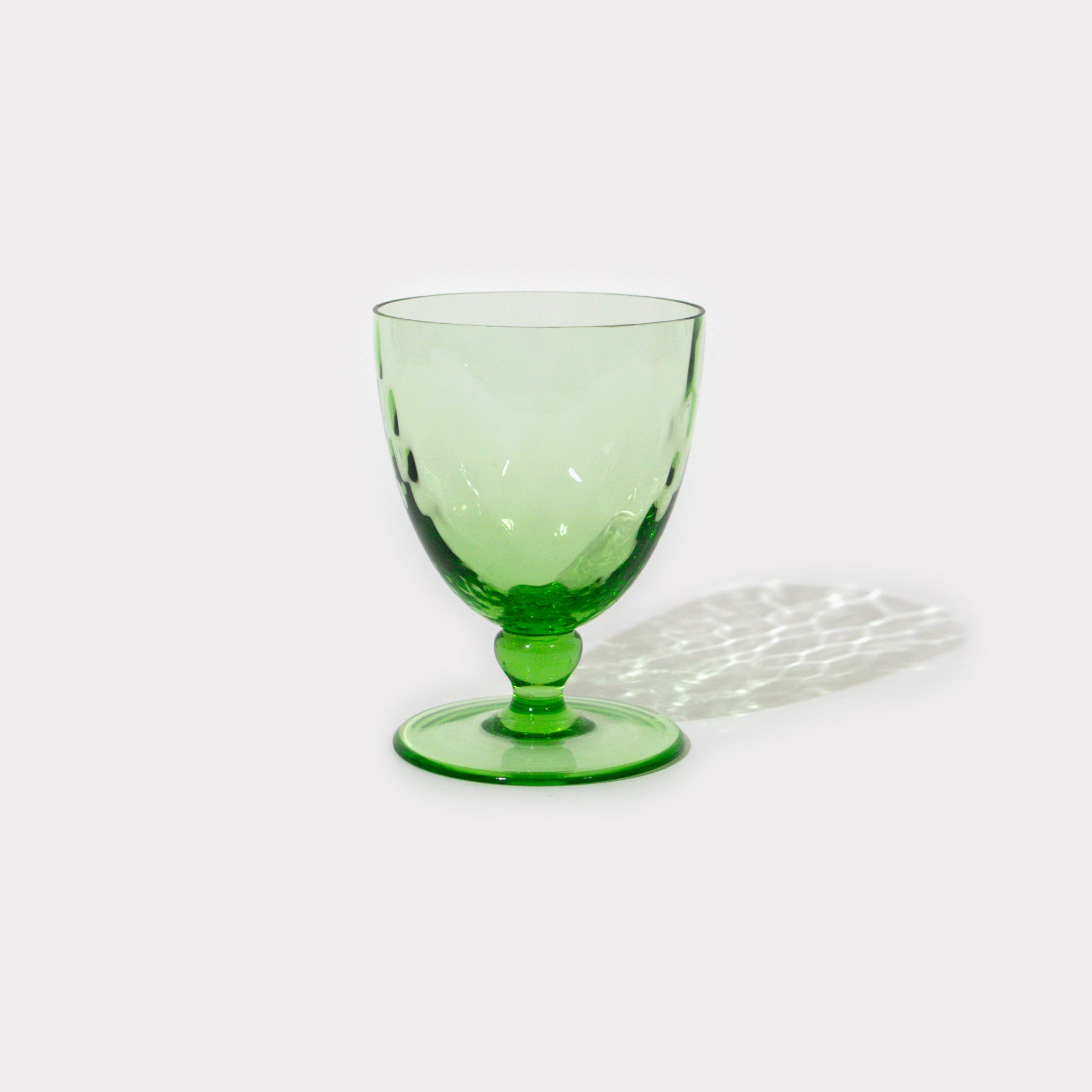 A simple green depression glass wine/water goblet, with an optic patterned bowl and short stem. Sold individually.