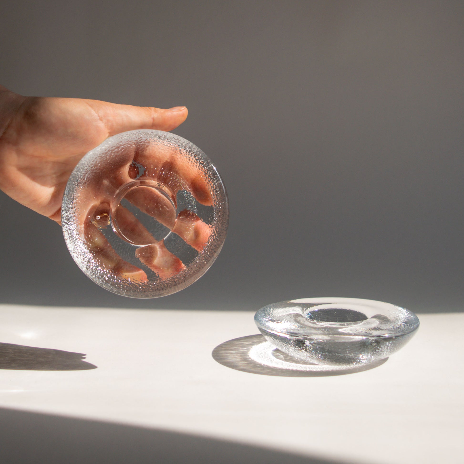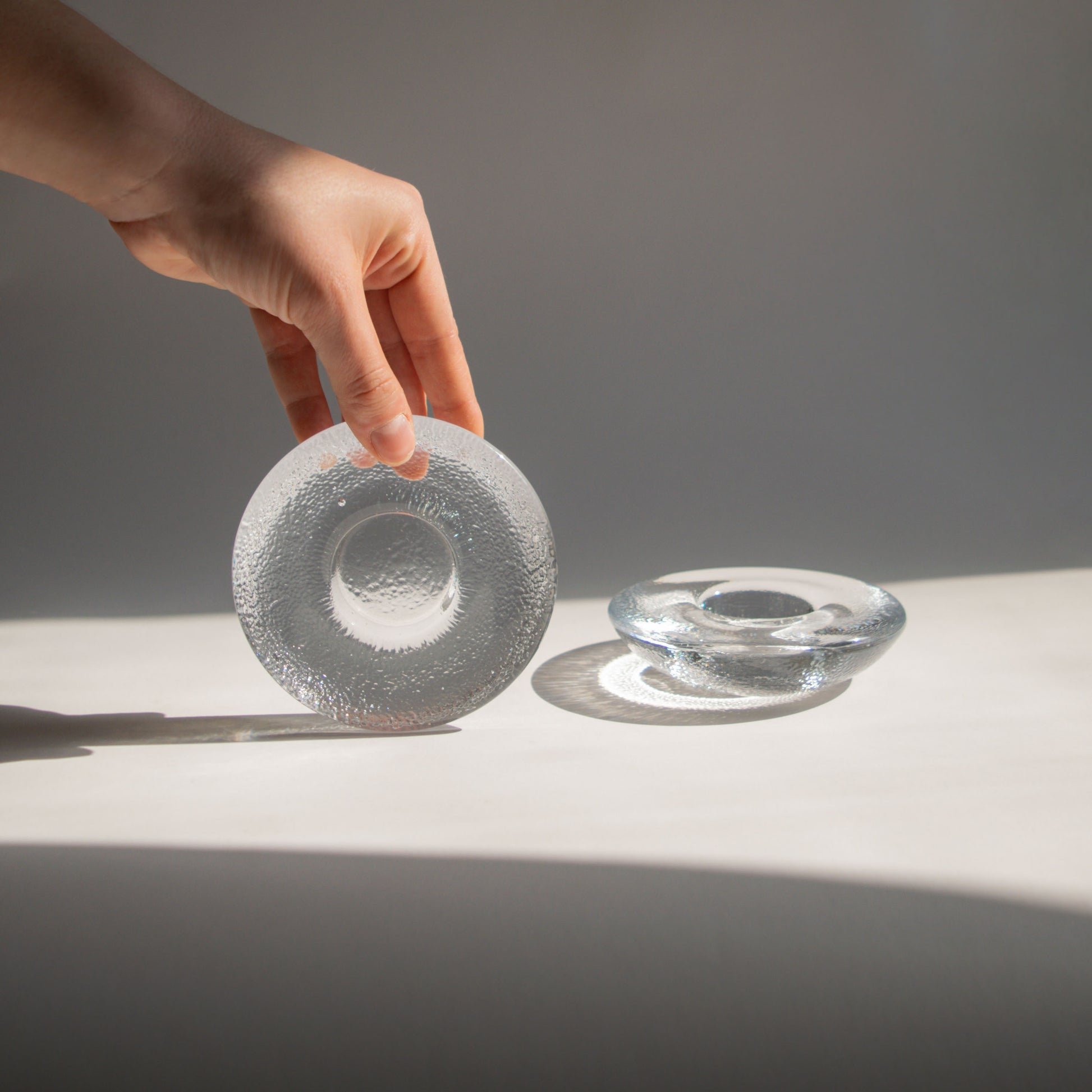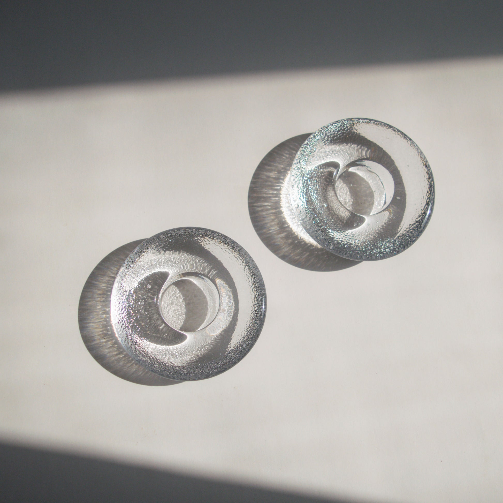 Gorgeous, textured glass candleholders from Iittala, made in Finland. They feature a weighted, round flattened shape with a central round depression, fitting for a tealight candle. Designed in the 1990s by Markku Salo, the modernist "Nappi" design means "button" in Finnish. Sold as a set of two.