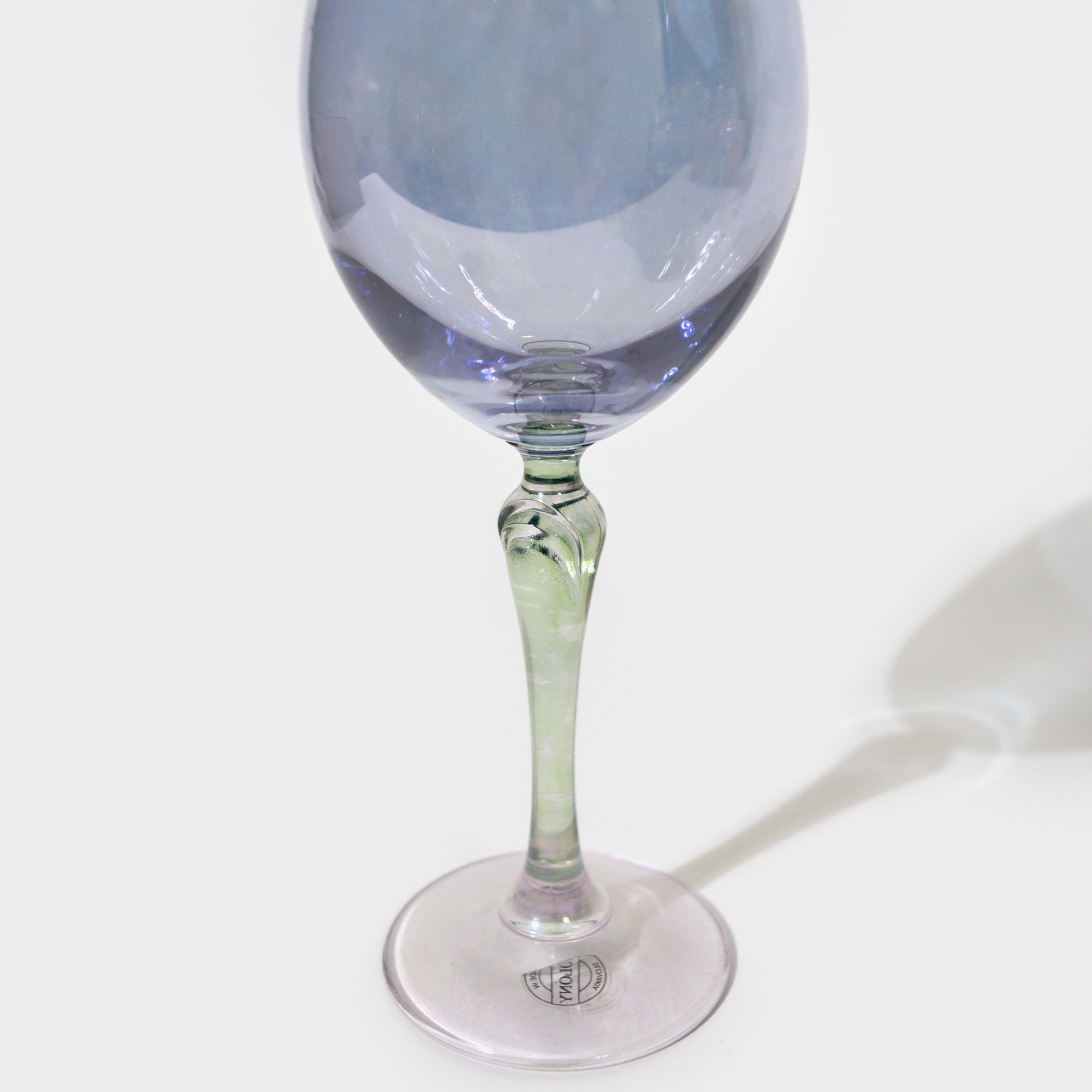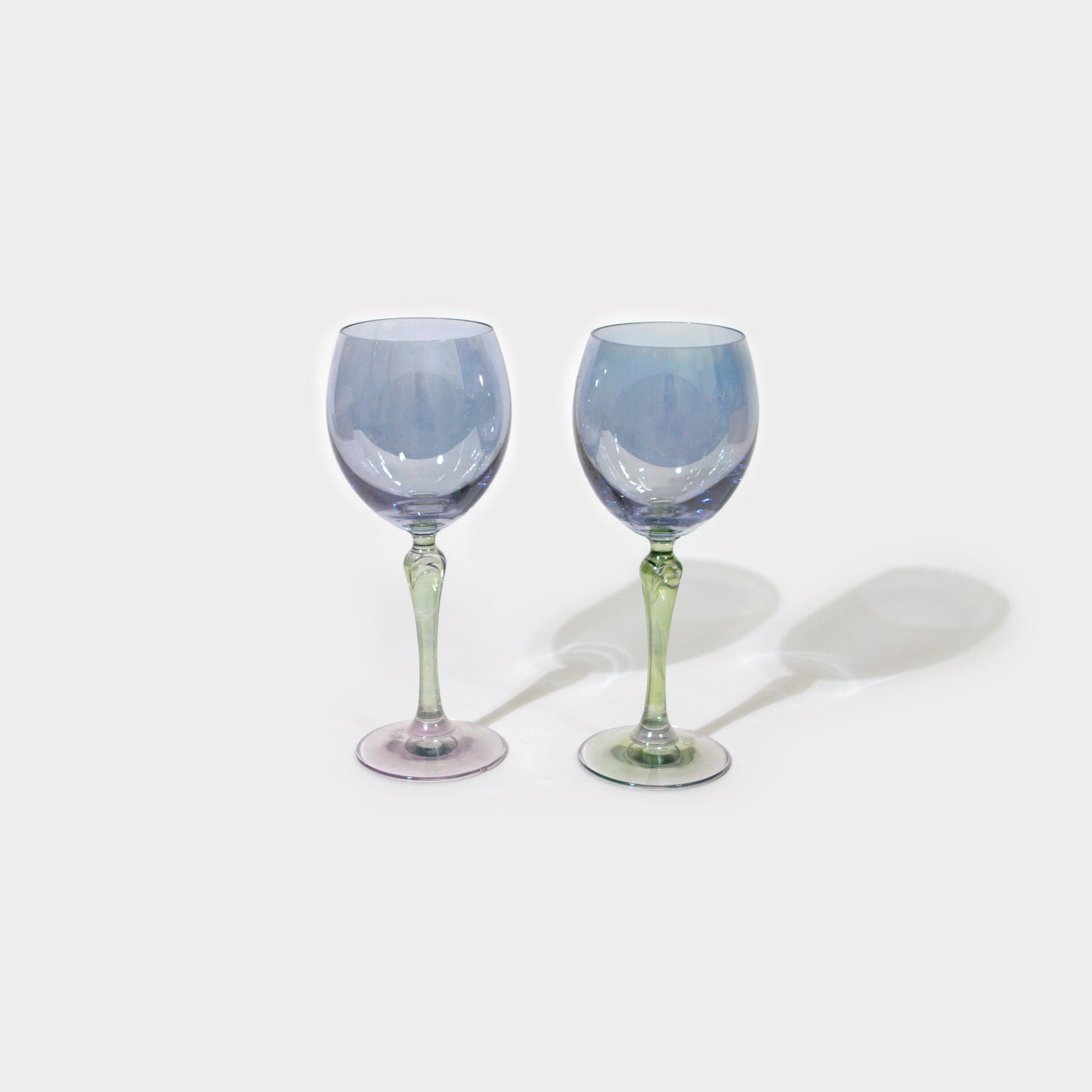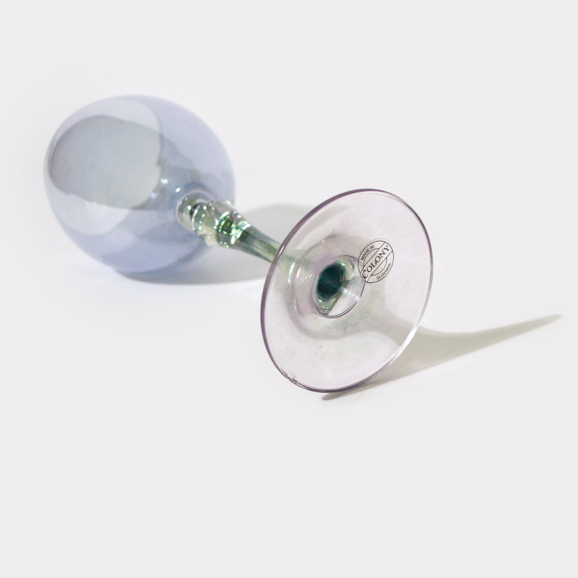 These charming vintage iridescent two-toned wine glasses in the "Bijoux" pattern by Colony Glass feature a distinct art-deco-inspired tulip pattern stem and bluish-grey bowl. Made in Slovakia. Sold as a set of two.