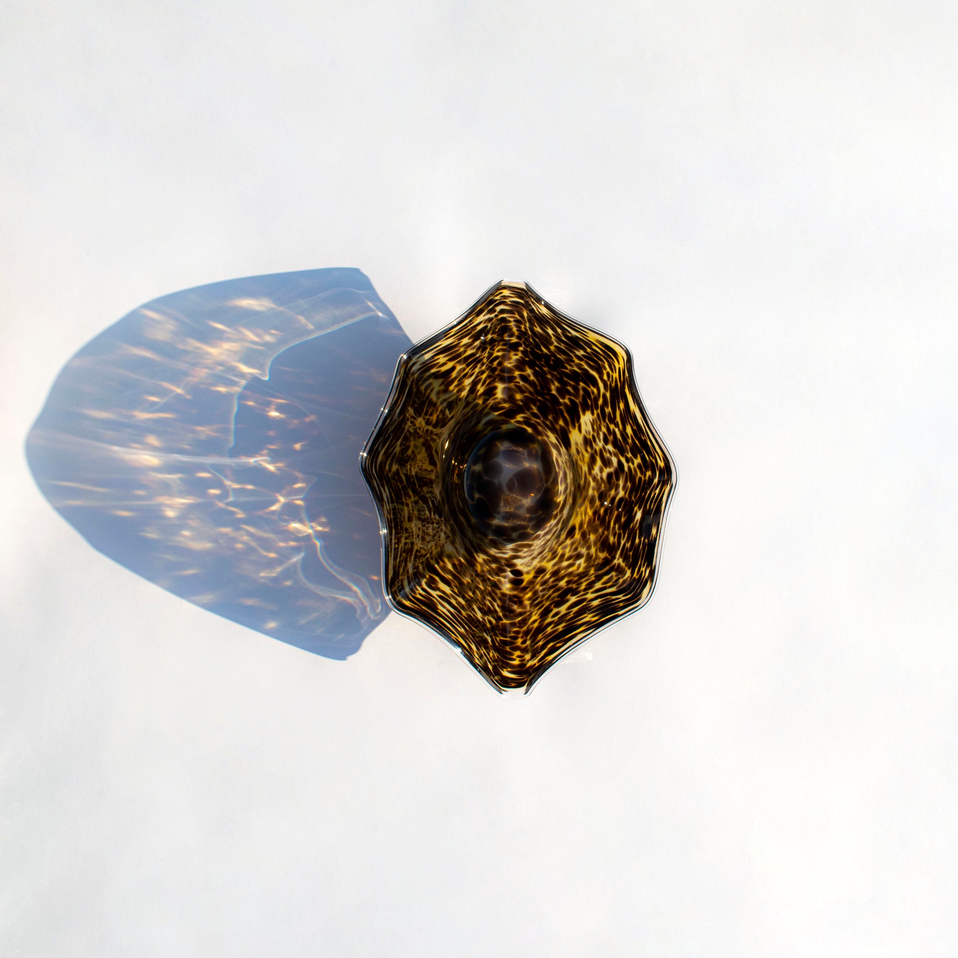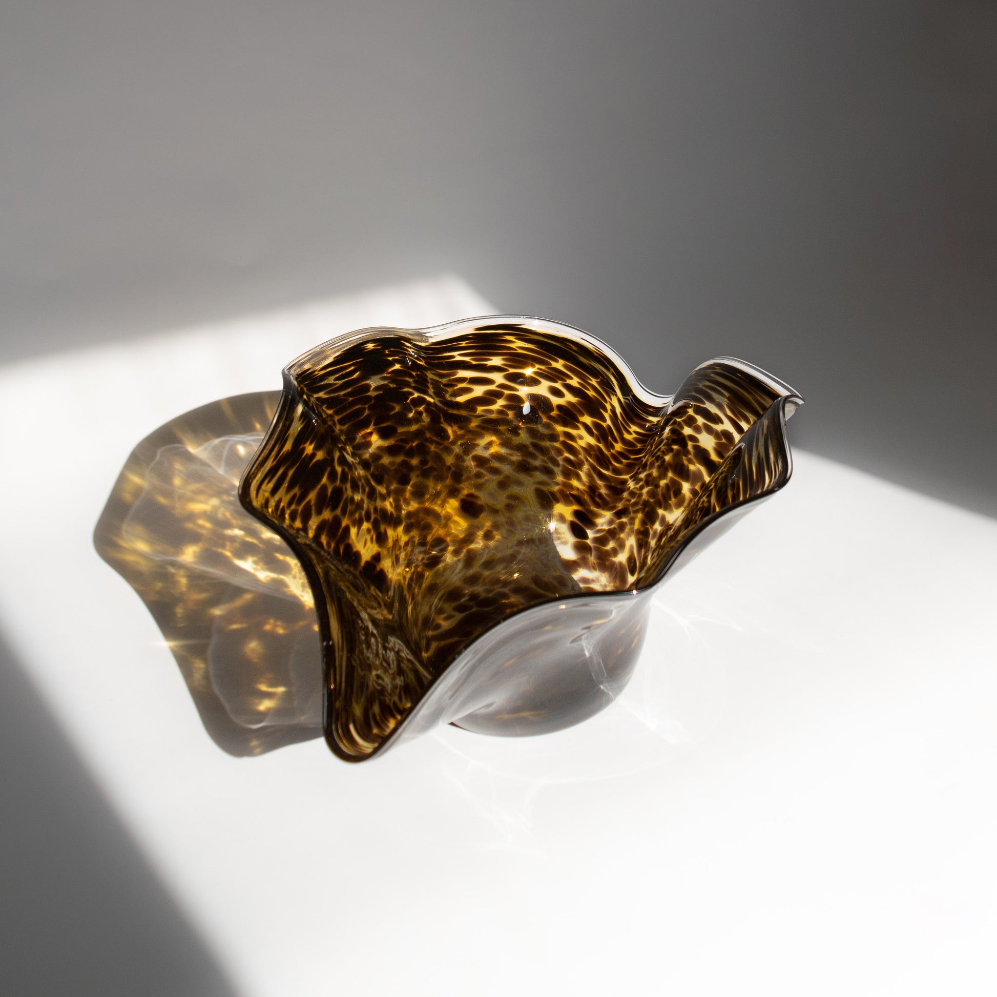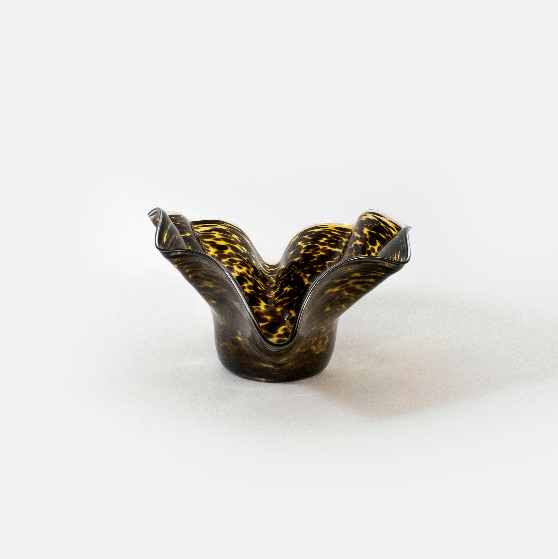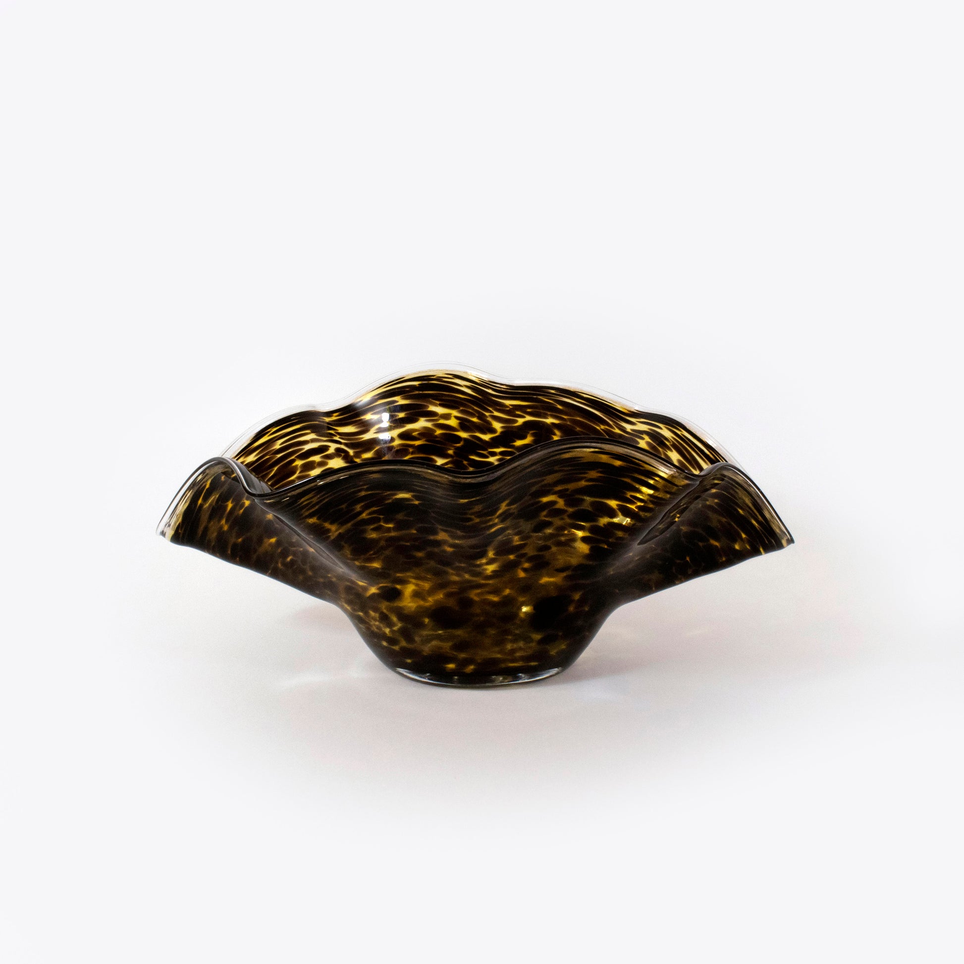 Hand-blown tortoise shell art glass bowl, made in Poland by Zorza. Incredible color and wavy edge detail.