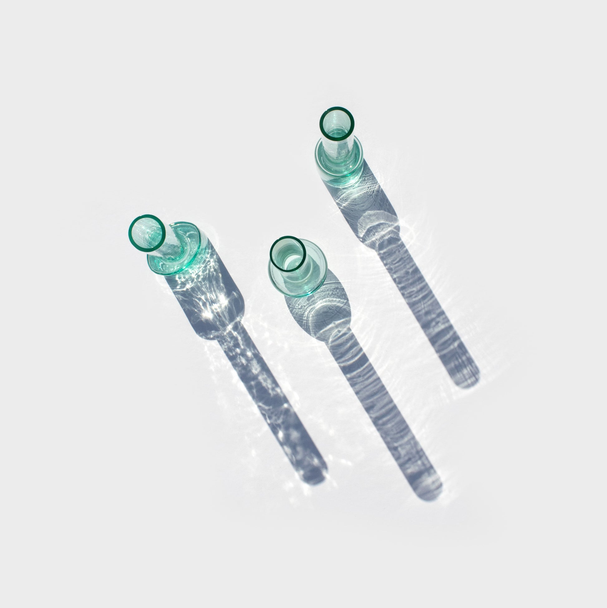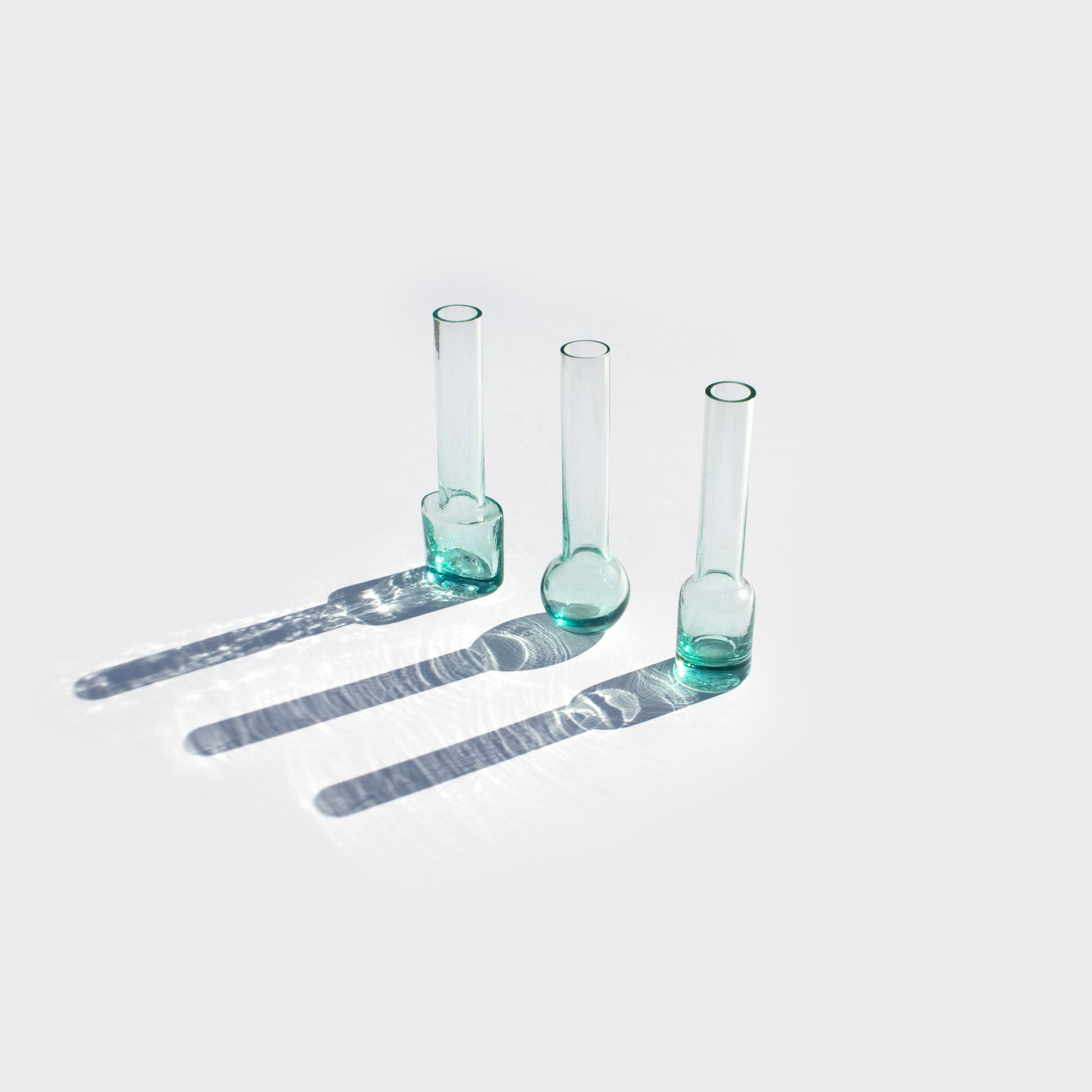 Super cute light blue trio of vases with slender stems and differently-shaped bases, that compliment each other perfectly. These can be used for propagating or holding a few stems each, and are great for tight spaces or in a bud vase tablescape. Sold as a set of three.