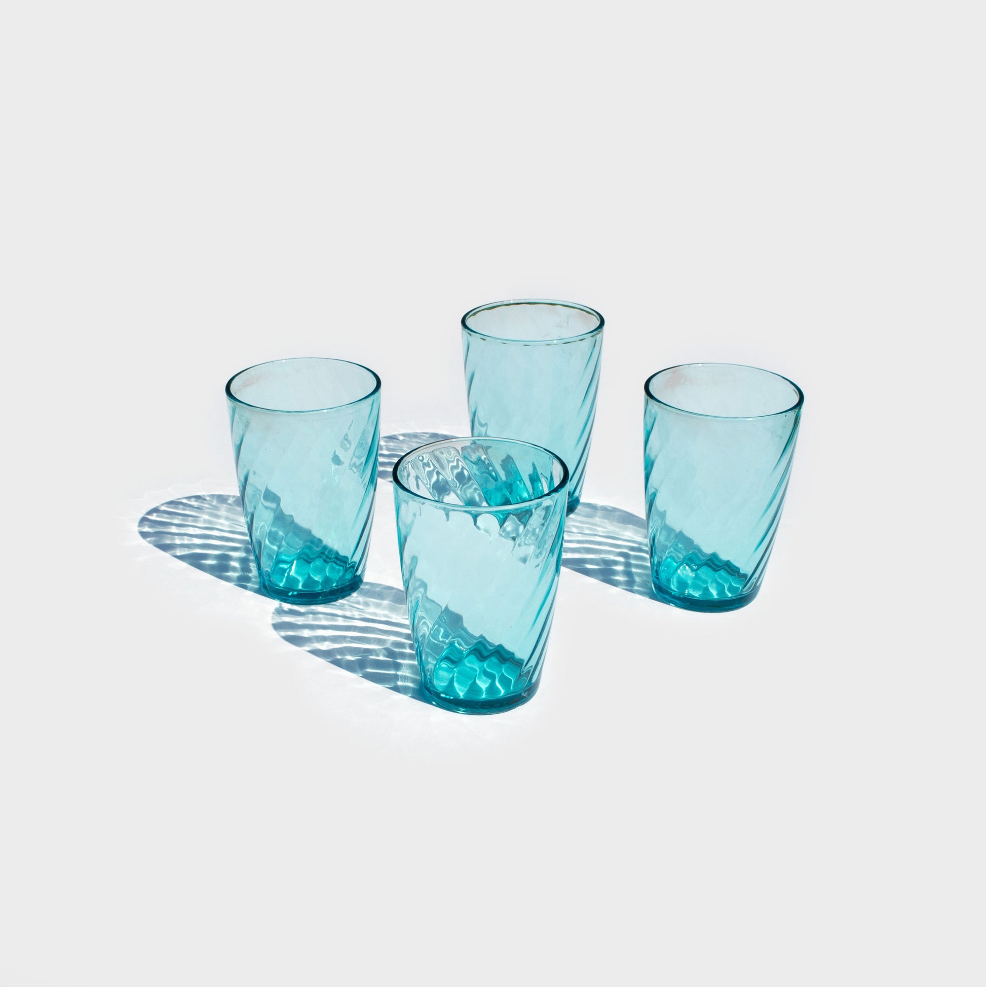 Simple water/juice glasses in a turquoise blue color and ribbed swirl pattern. Each glass has a marking like "A-8" or another number on the bottom. Perfect for everyday use. Sold as a set of 4.