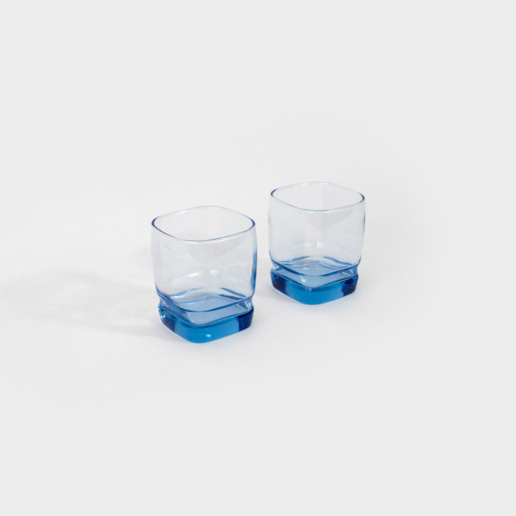 Vintage light blue-colored tumbler glasses in the "Carrington" pattern by Libbey. Has a unique heavy square base. Great for everyday use and adding a classic, mid-century modern element to any space. Sold as a set of two.