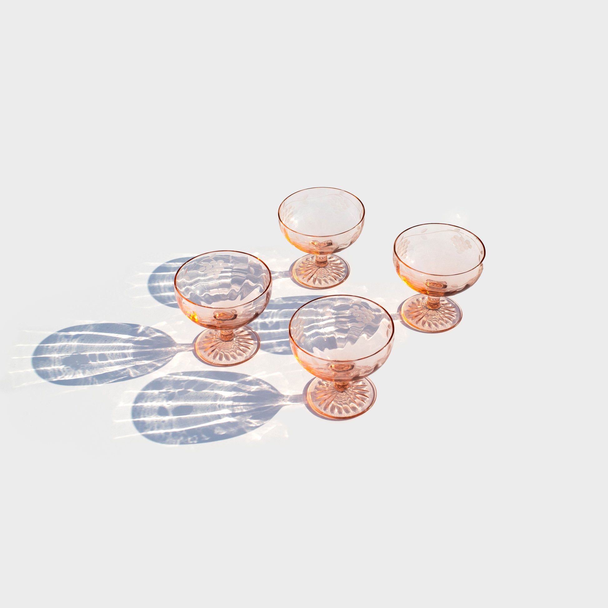 Vintage depression glass champagne coupes with a lightly etched surface in a floral motif, and starburst-patterned base. Perfect for cocktails, champagne, or desserts. Sold in sets of four or five.