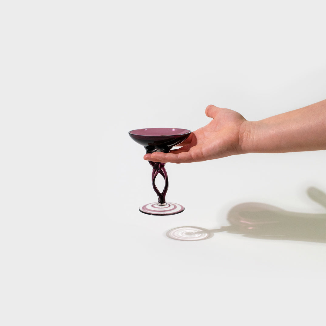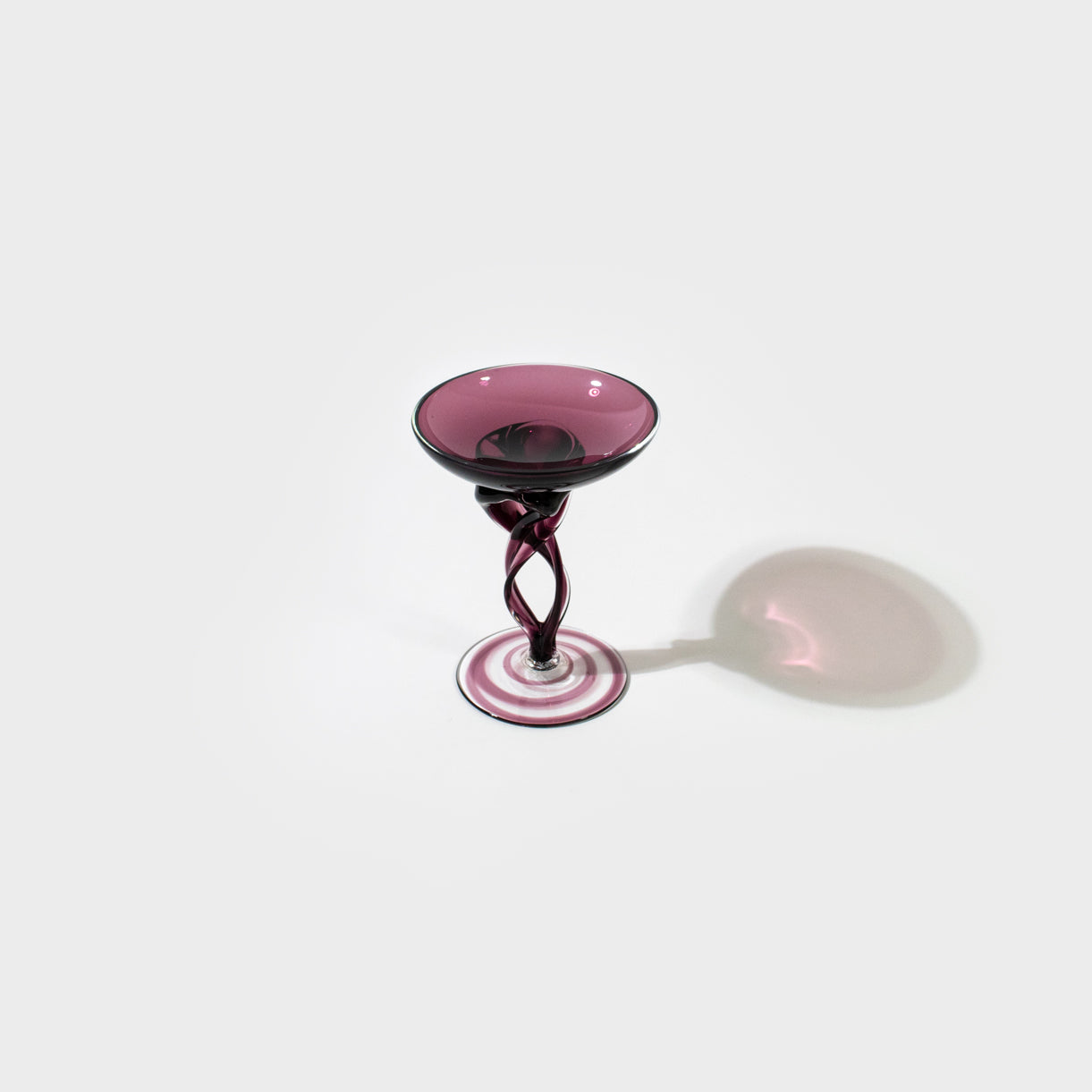 Hand blown art glass pedestal dish, in a deep eggplant purple color with a swirled color and twisted applied glass base. A smaller iteration of the Jozefina Jellyfish pedestal dish, made by Krosno Glass in Poland. Perfect size for candles, or displaying other small items.