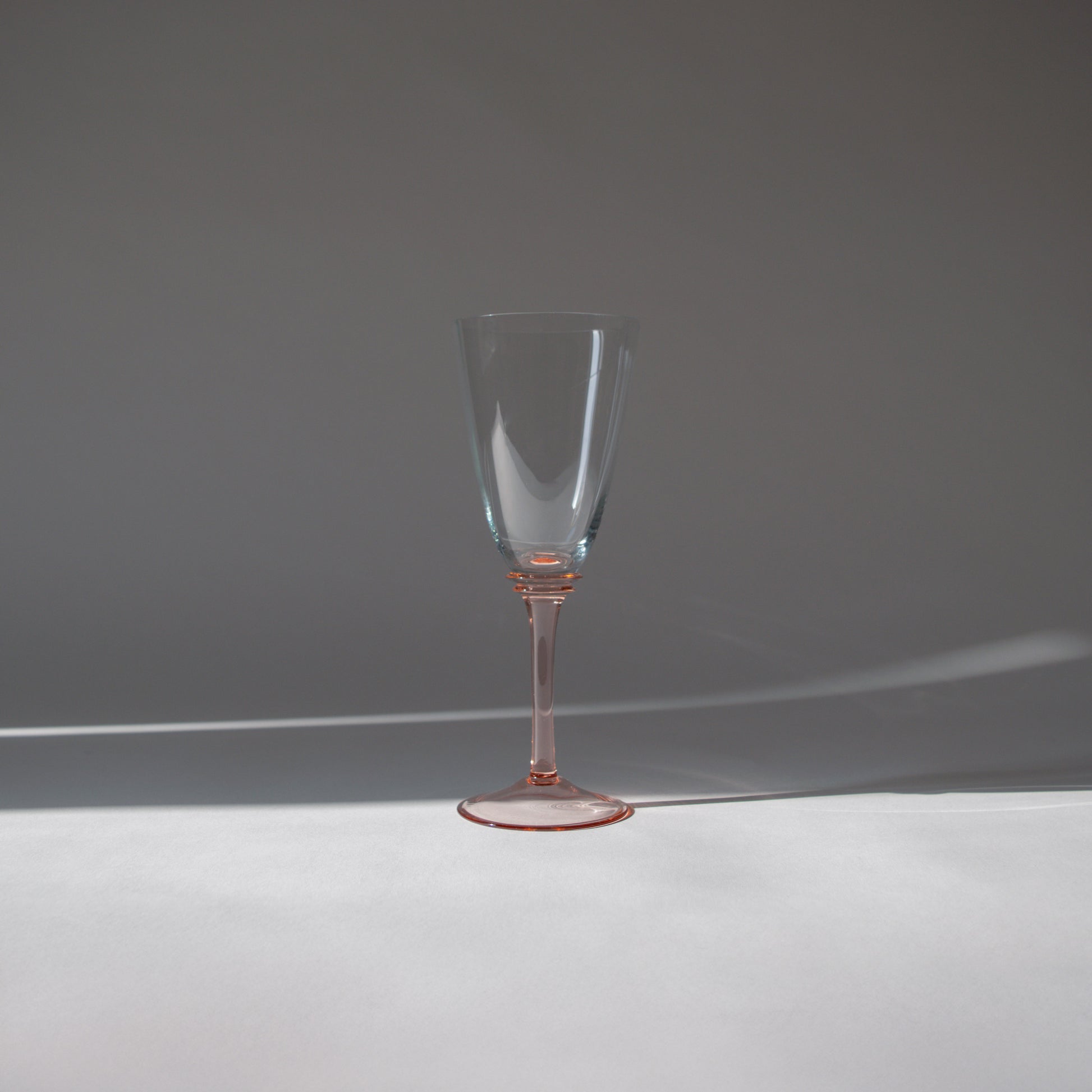 These delicate vintage handblown crystal wine glasses feature a subtle optic pattern in the bowl and a pink-colored wafer stem. The stems of these textured wine glasses are intricately designed and exude a soft pink or peach hue, depending on the lighting. Sold individually, three available in stock.